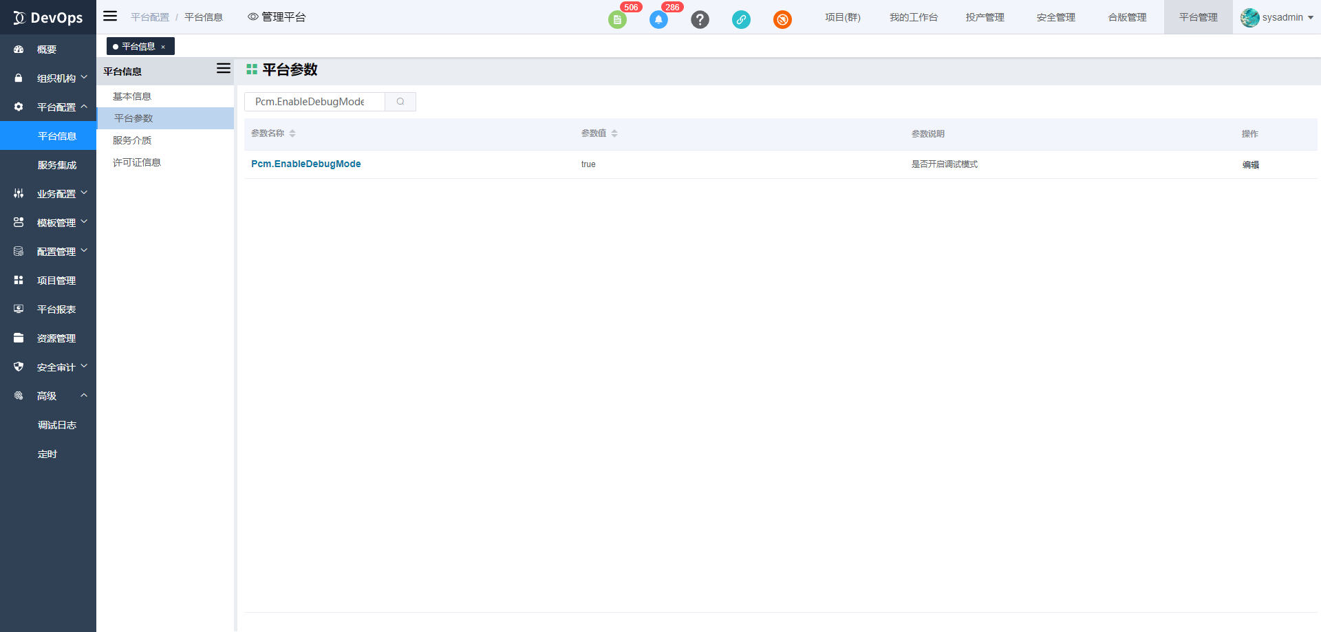 通过平台配置-平台信息-平台参数-Pcm.EnableDebugMode配置为true开启DevOps平台调试模式。