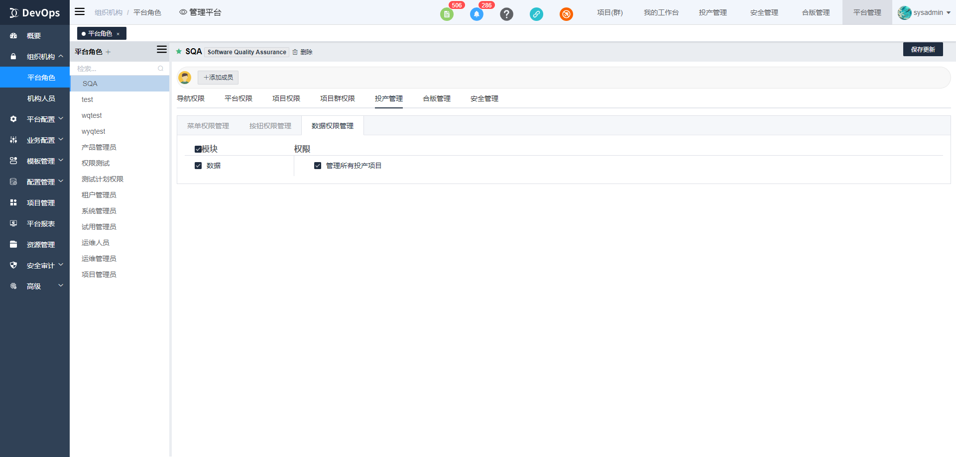 额外说明:拥有管理所有投产项目数据权限的角色可以在所有的投产项目中进行投产相关的配置权限。