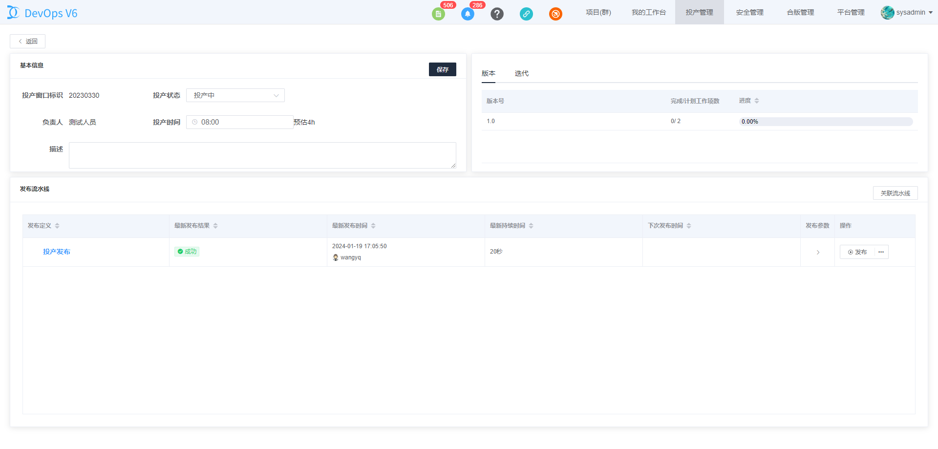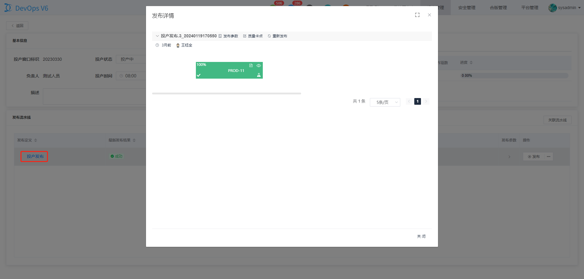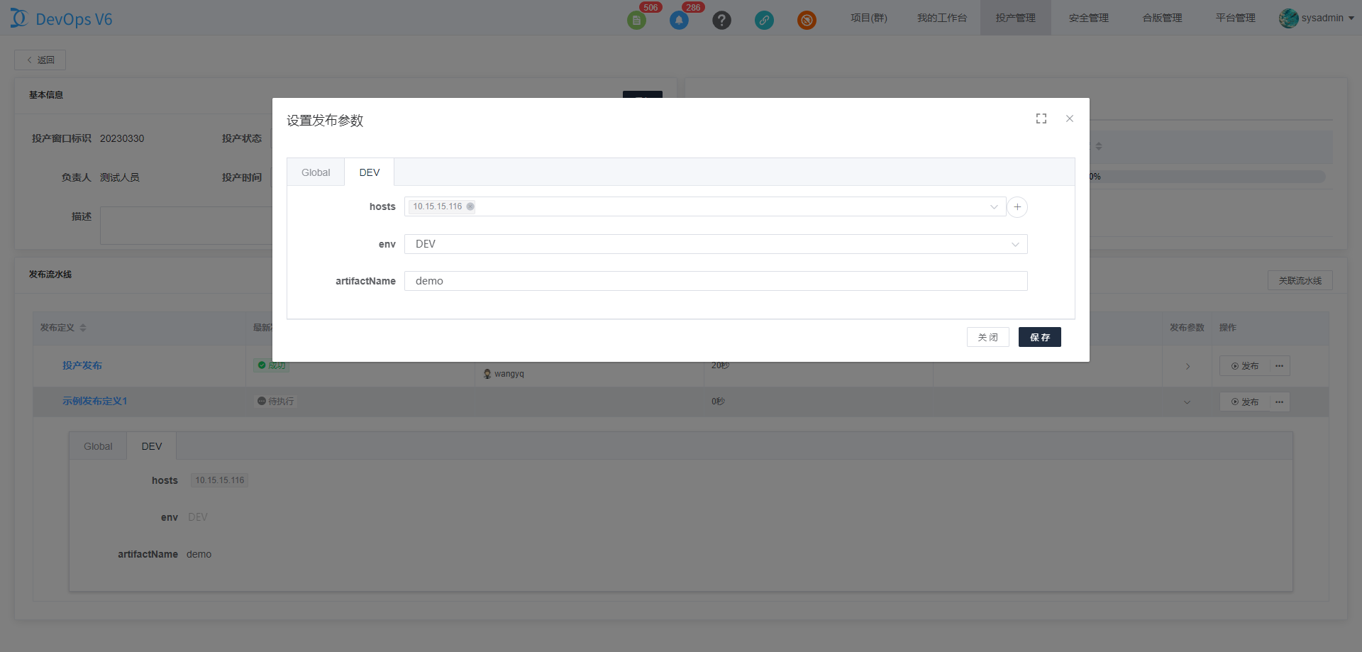 点击发布参数三角按钮,可以浏览投产流水线预设的投产参数。