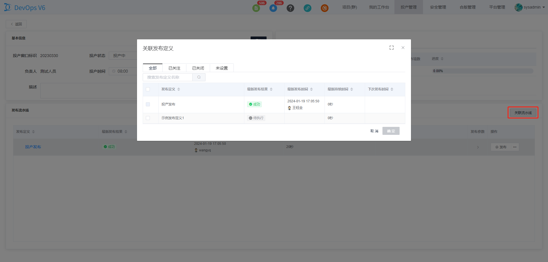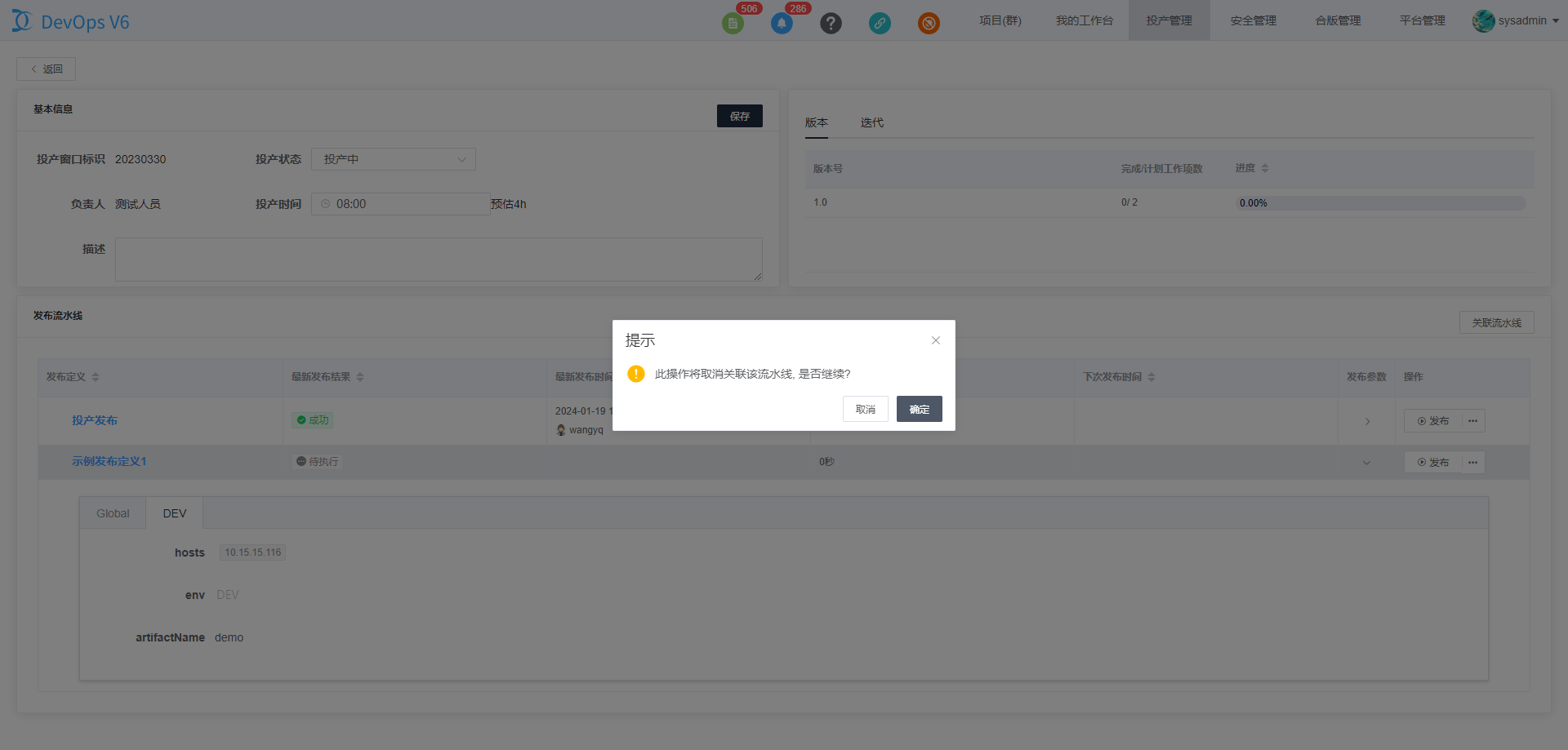 点击取消关联流水线,可以将已关联到投产项目的投产流水线移除。