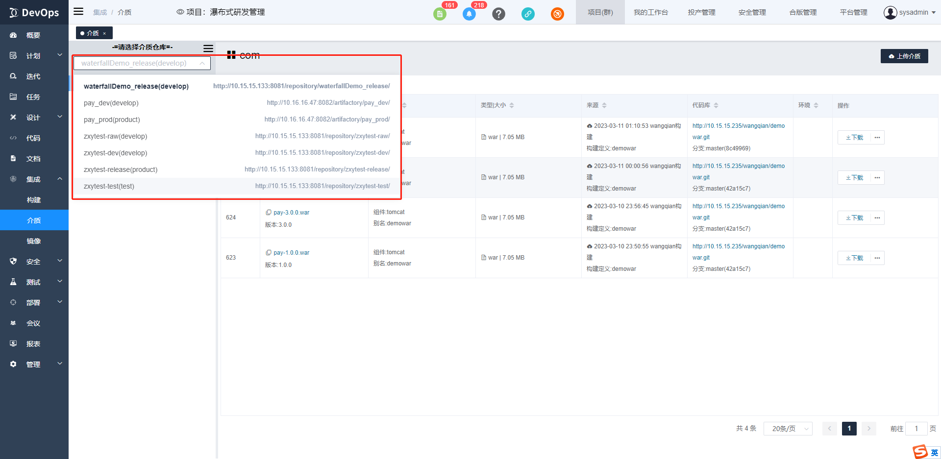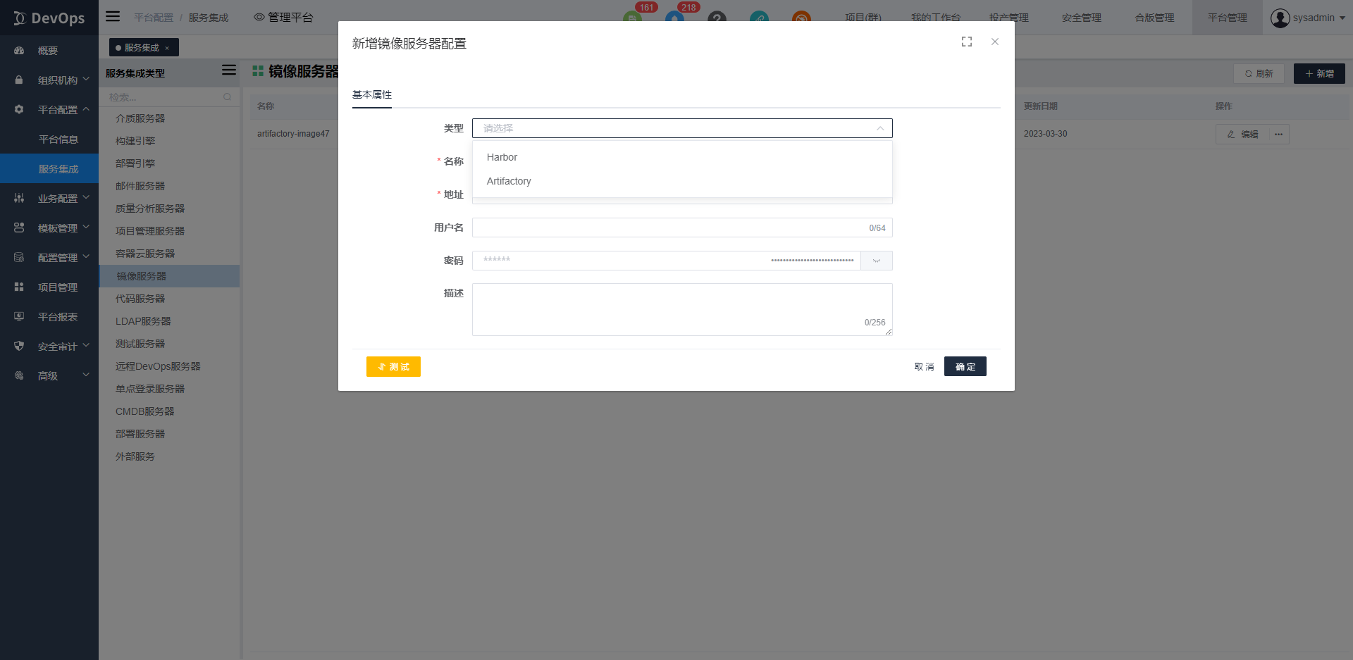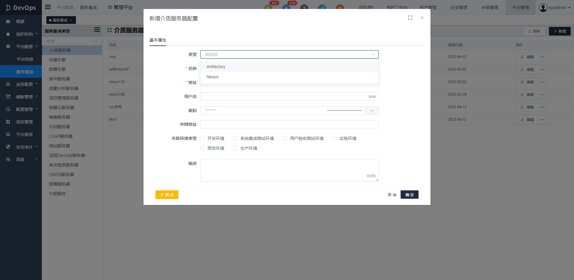 制品库管理是项目实施过程中必不可少的一个环节,它可以辅助项目负责人对制品的版本进行控制,也可以与CI、CD环节做到无缝衔接,同时为制品的安全扫描、依赖扫描提供了便利,DevOps默认支持关联nexus、artifactory作为项目介质管理的三方服务,支持关联harbor、artifactory作为项目镜像管理的三方服务,支持拓展集成。