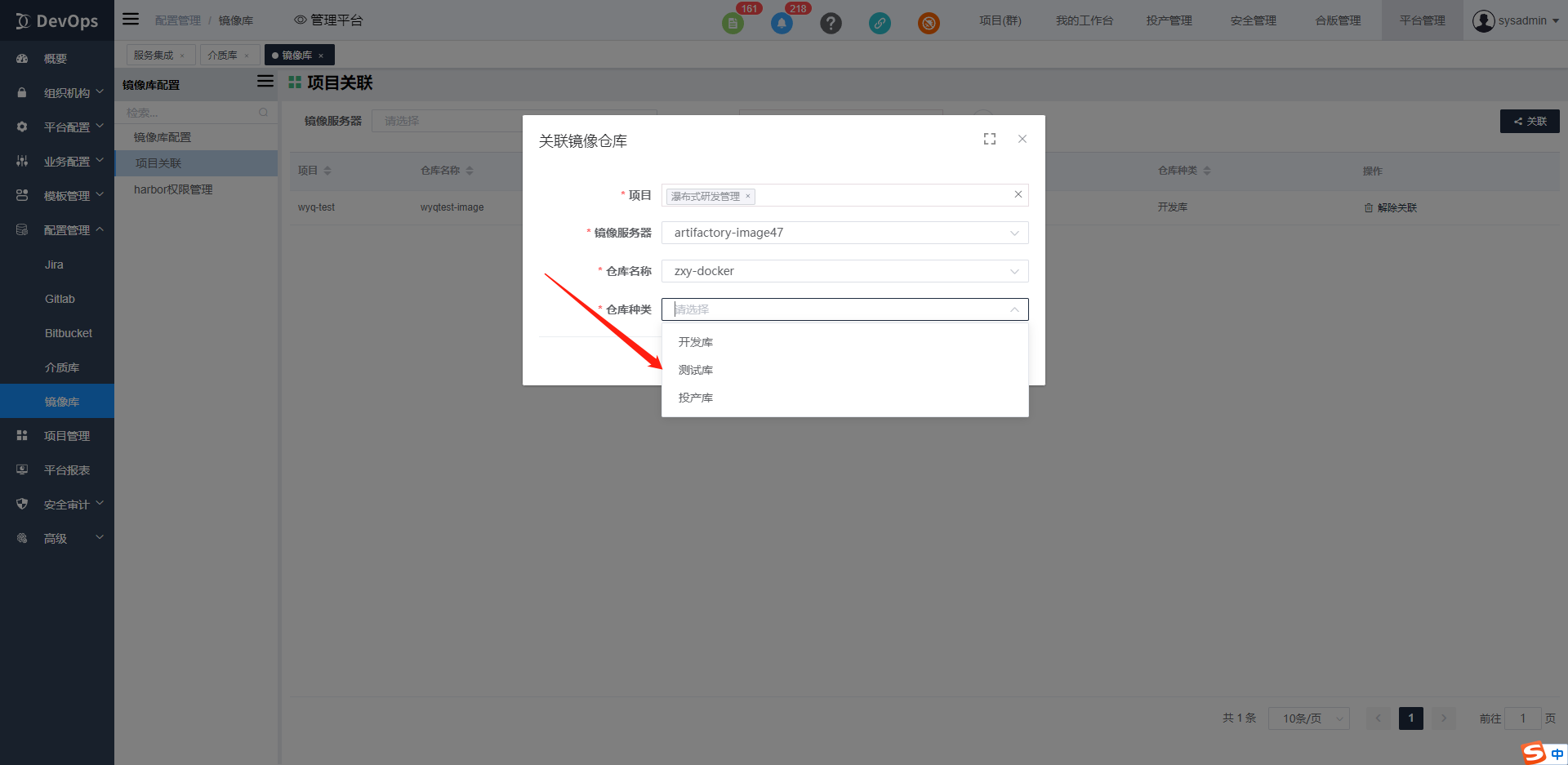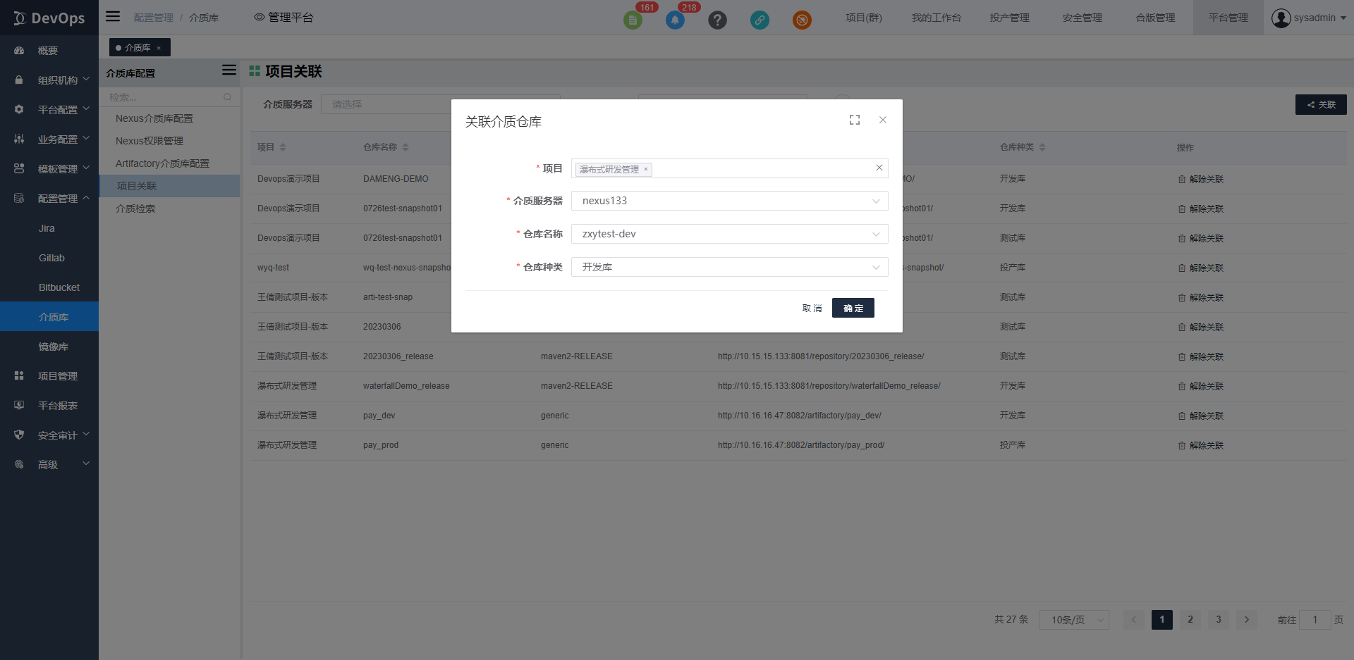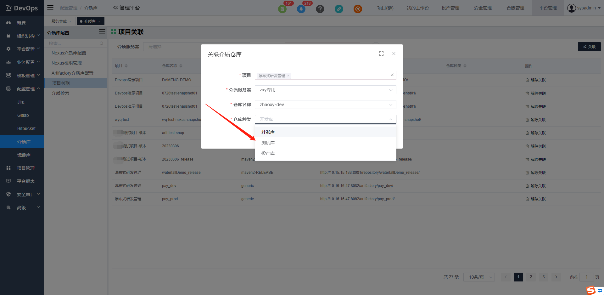 再由平台配管在平台管理-配置管理-介质库-项目关联将创建好的制品库关联至项目。