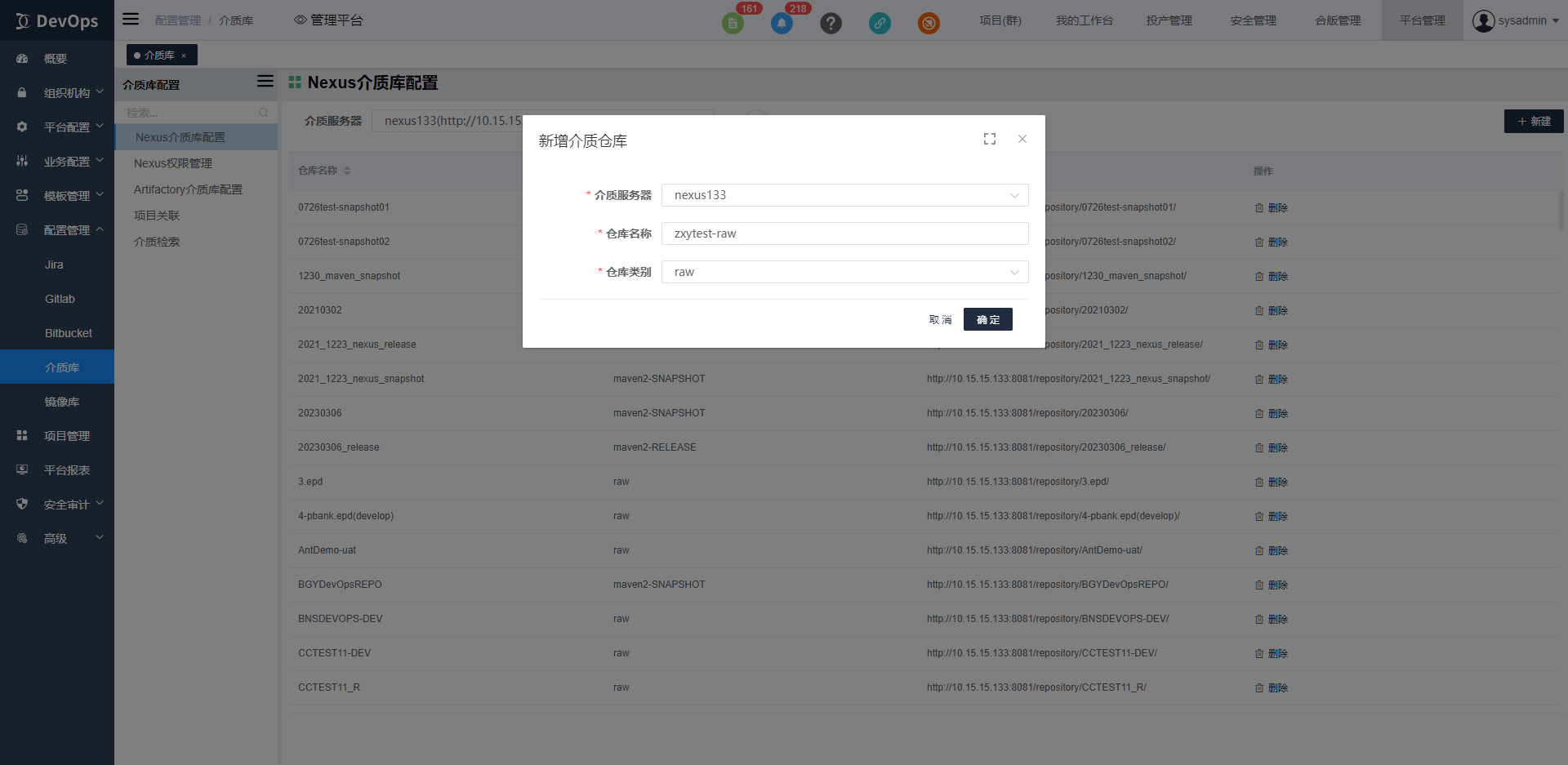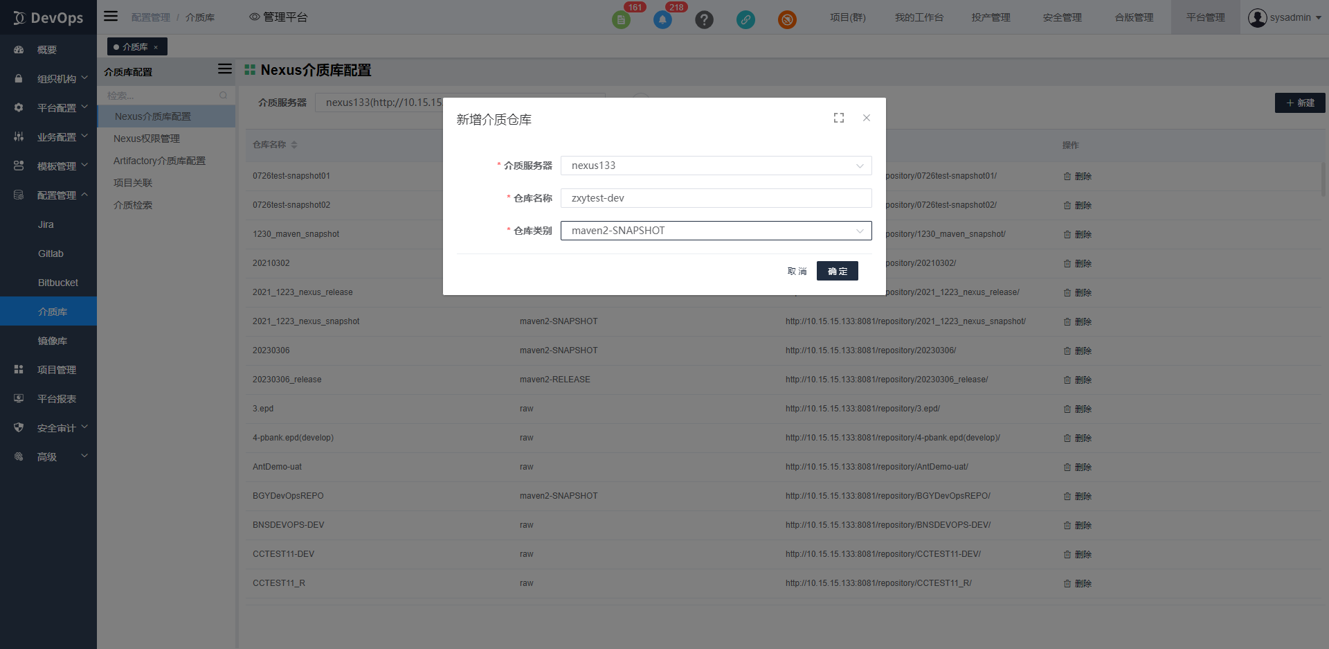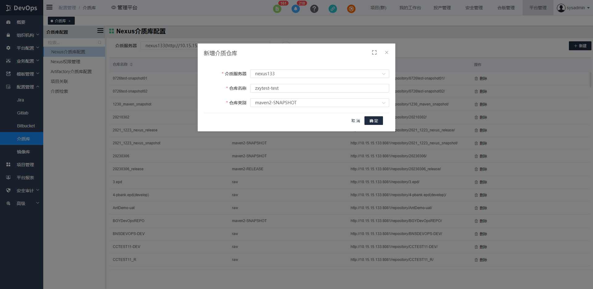 以Nexus服务说明,项目创建后,应由平台配管在平台管理-配置管理-介质库-Nexus介质仓库配置初始化项目的制品库。