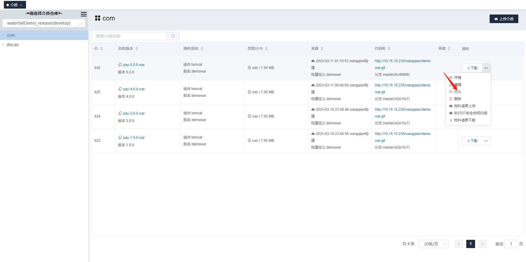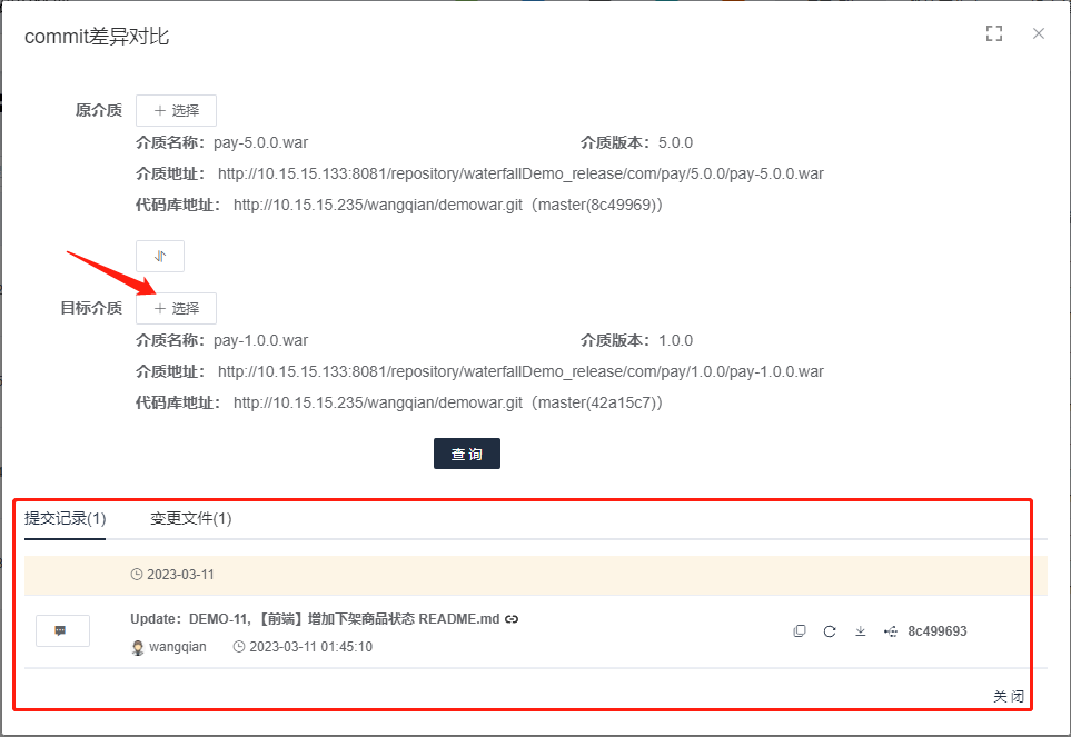 制品对比能力可以查看制品之间commit提交记录差异以及文件差异。