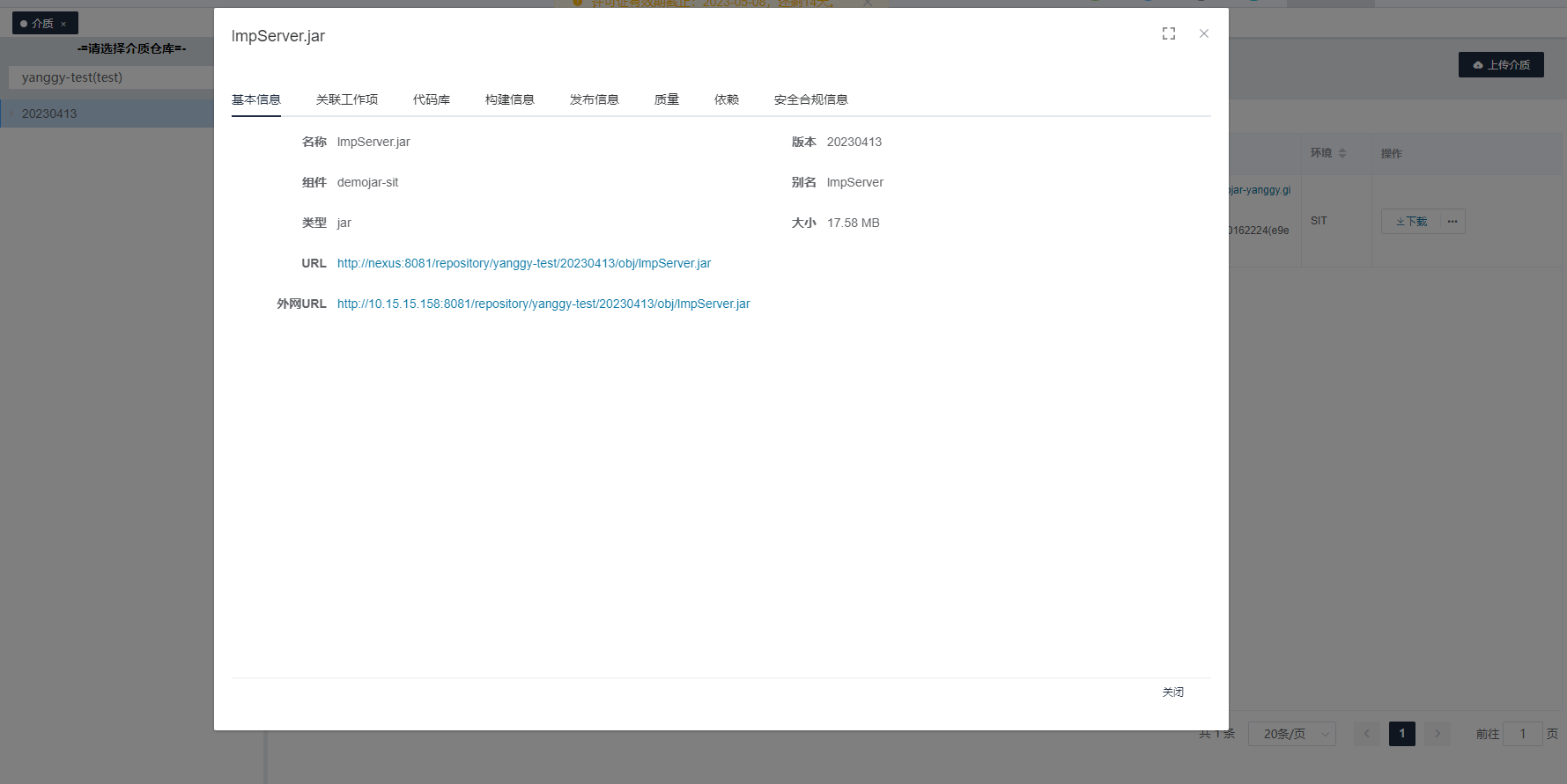 点击制品可以查看制品元数据信息,包括基本信息、关联工作项、代码库、构建、发布、质量、依赖、安全合规信息。