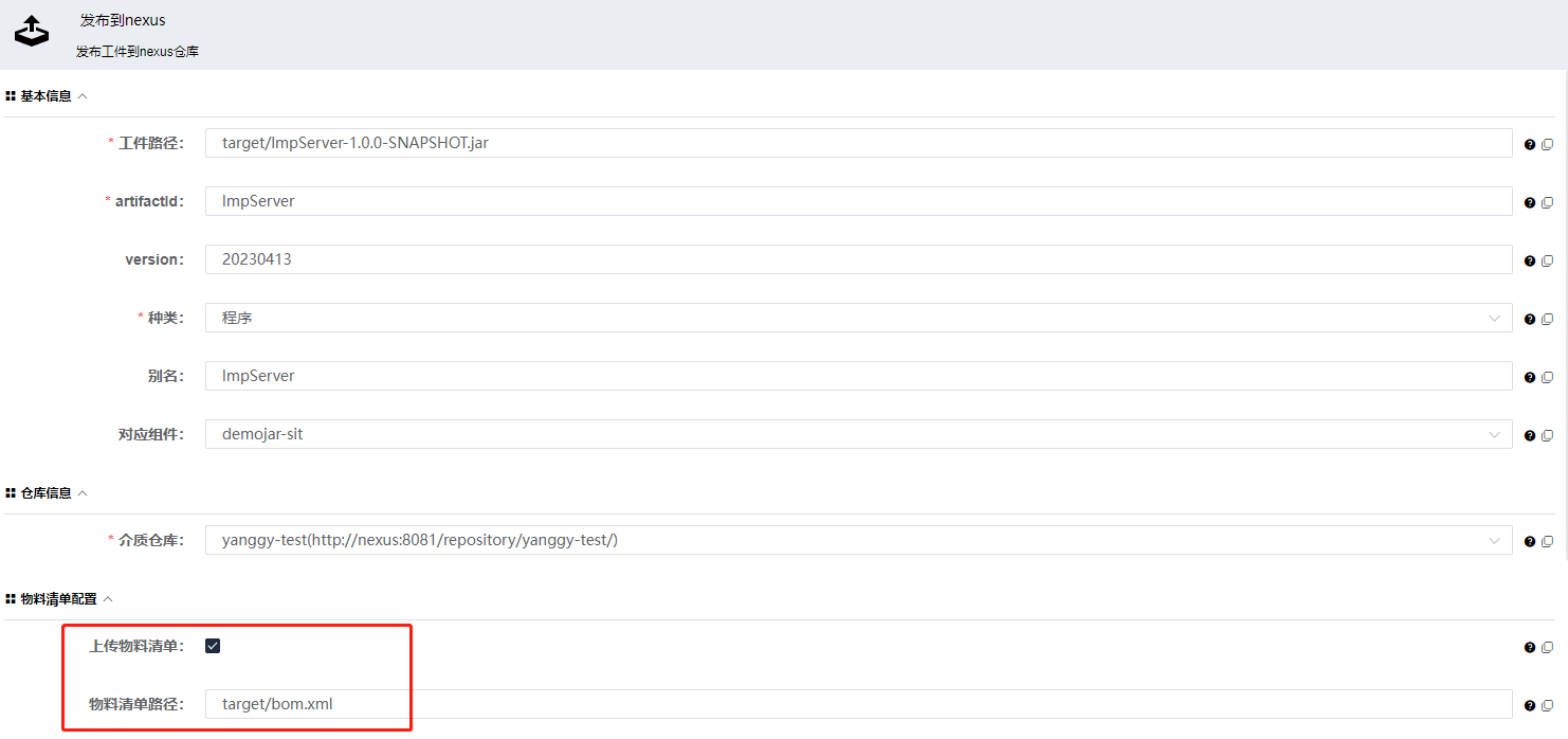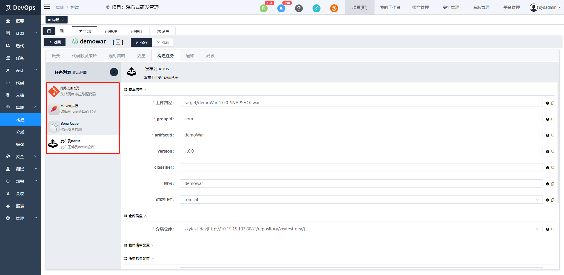 eg. 一条标准构建流水线,打包demoWar示例源码,工件路径配置制品的相对路径,groupId配置制品在制品库中的分组名称,artifactId配置制品在制品库中的标识名称,version配置制品版本信息。