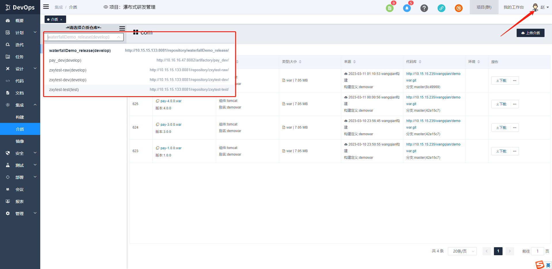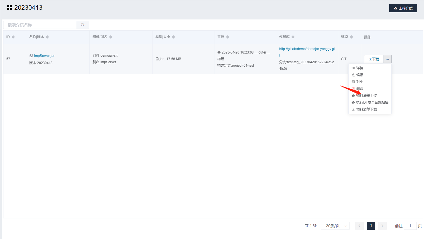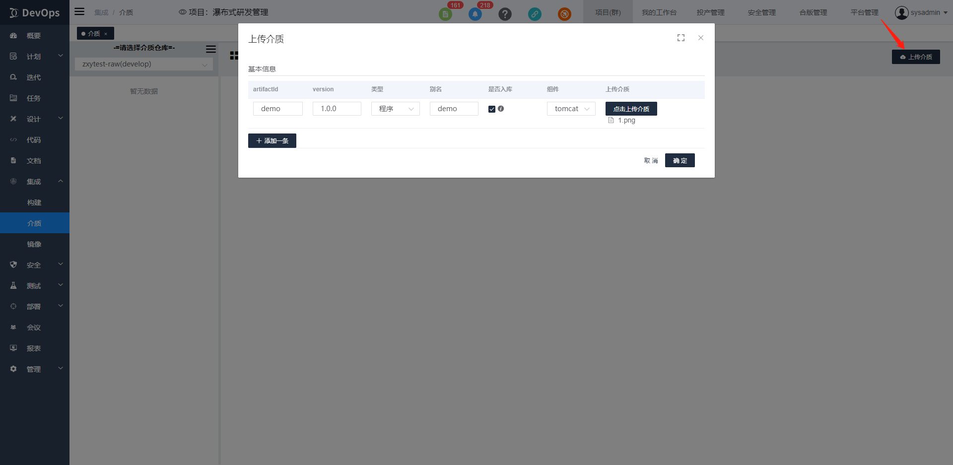 项目成员可以在介质页面上传介质到当前用户拥有环境权限的制品库。