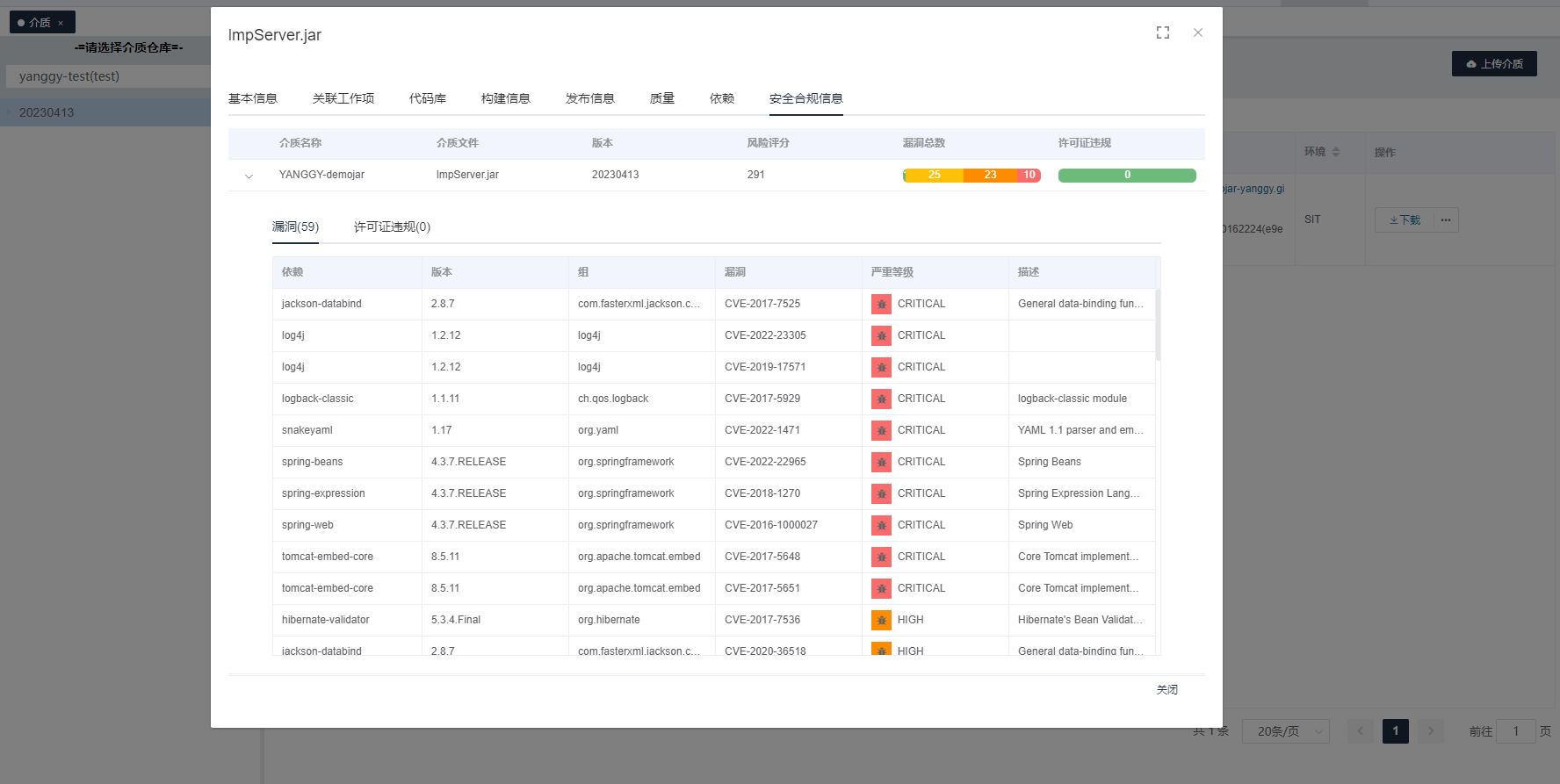 安全合规信息来源于创建安全合规扫描,一种方式通过流水线任务"安全合规扫描",一种方式可以在制品页面使用创建安全扫描功能。
