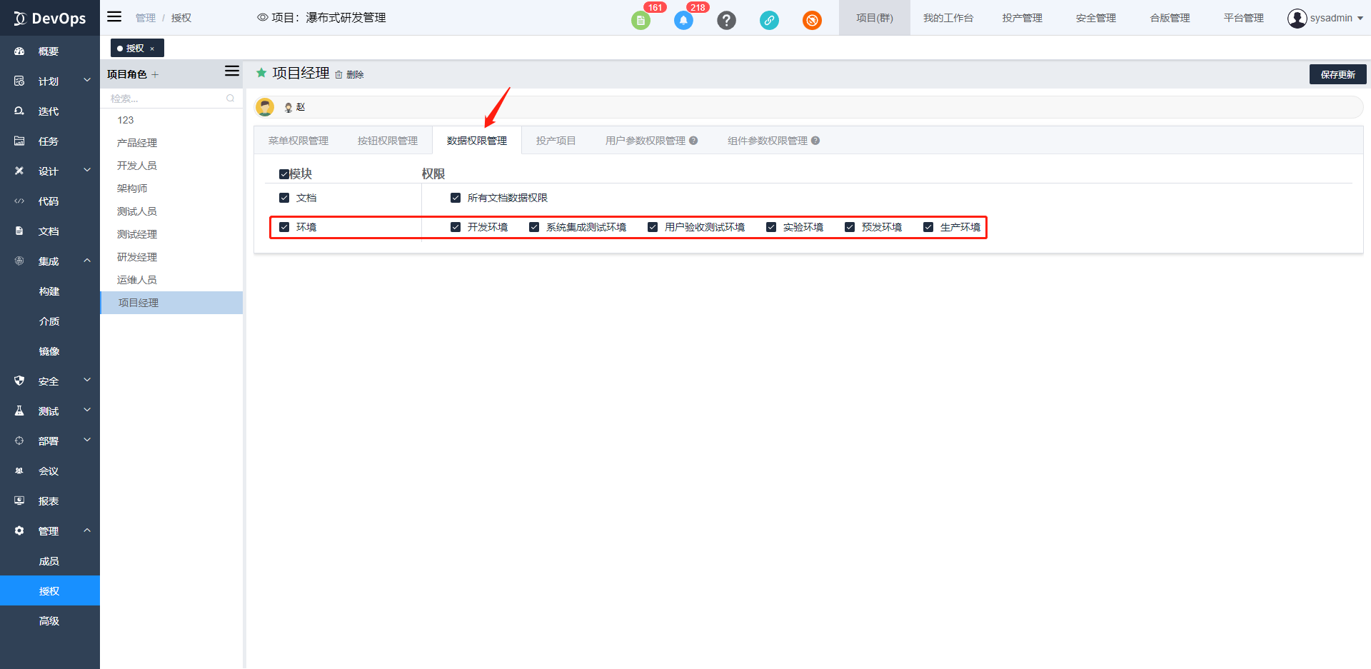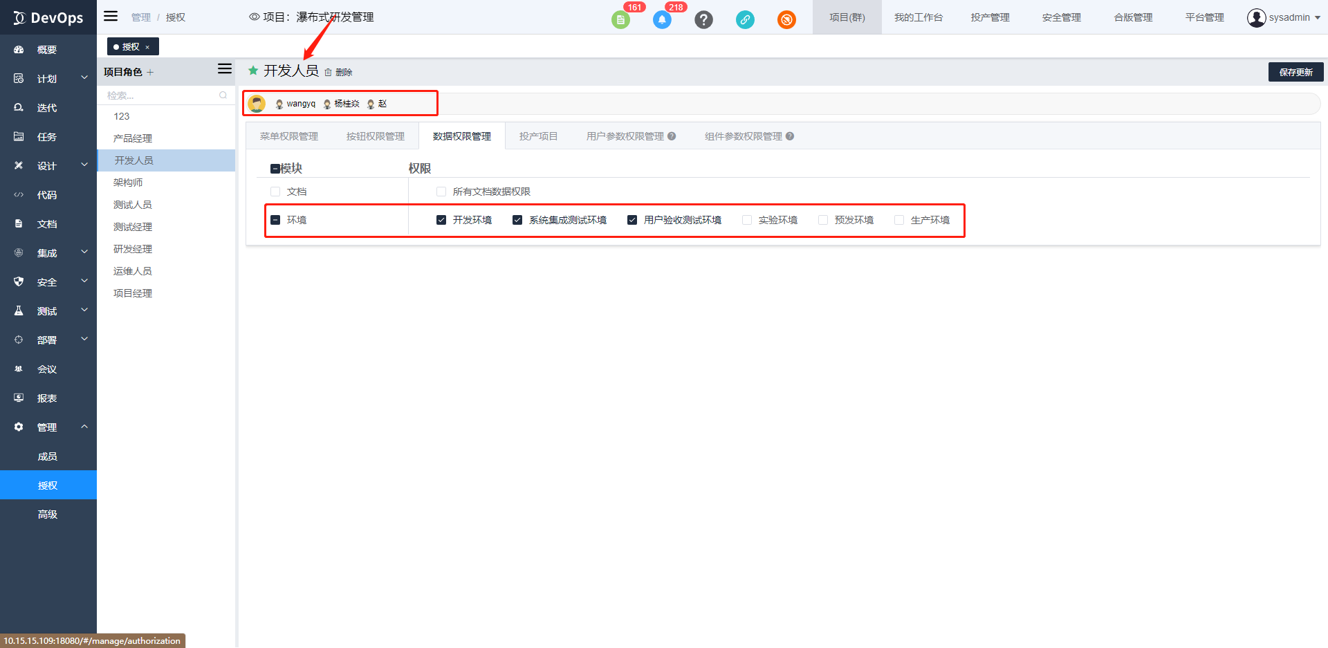 项目负责人需要对不同的角色分配不同的环境权限,并授予项目成员对应的角色,提高生产环境数据安全性。