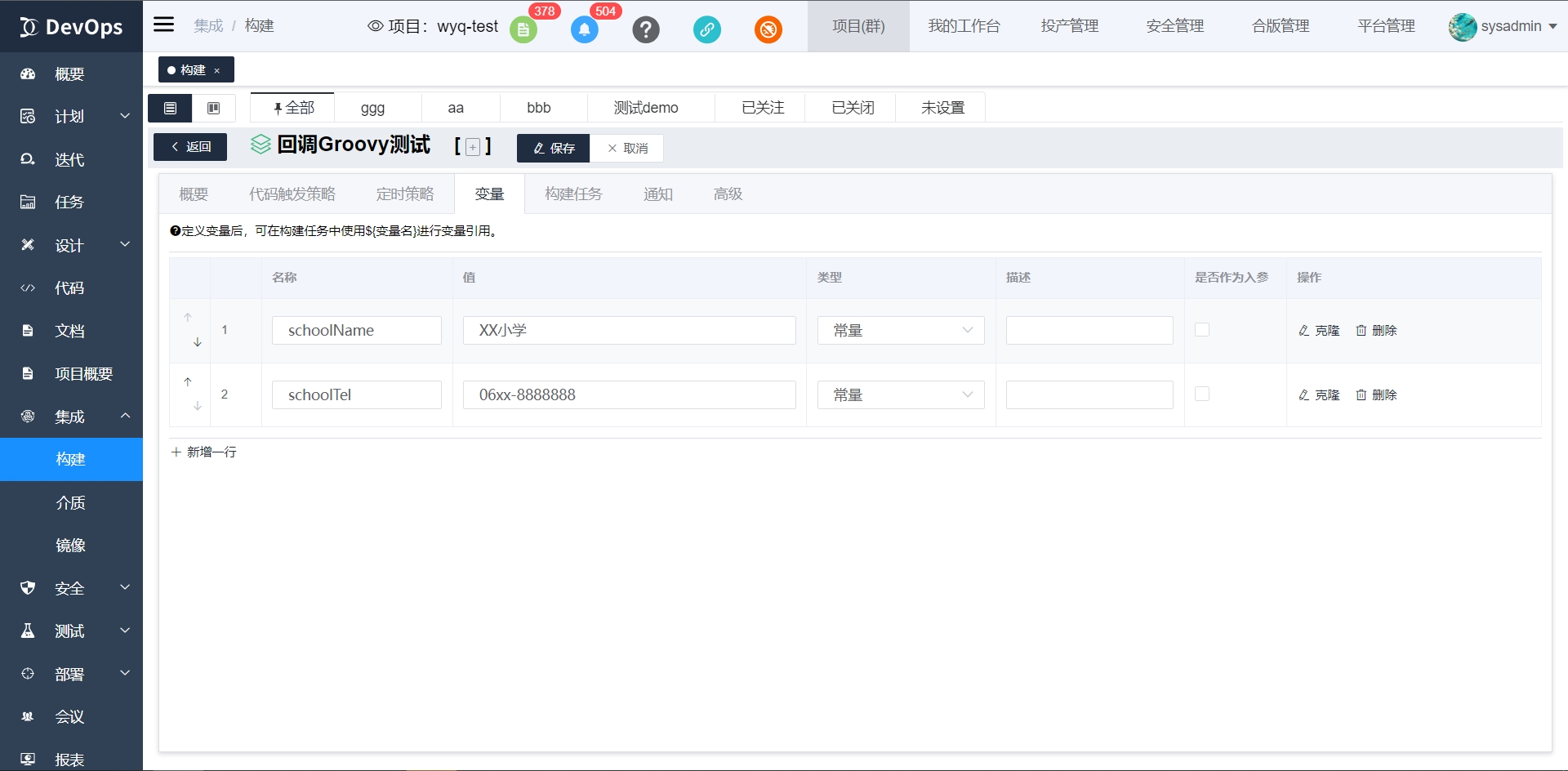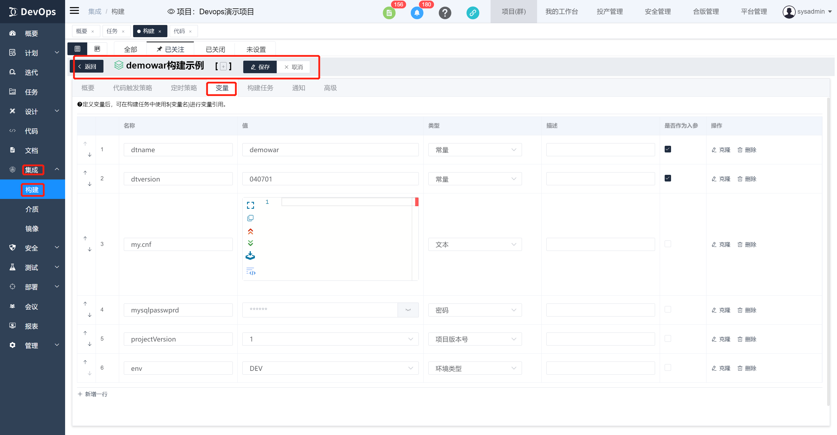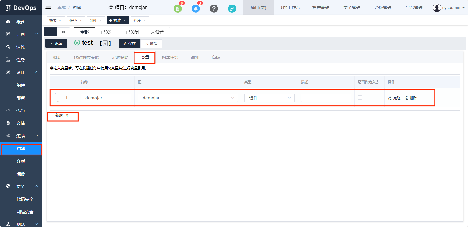 位置:构建定义点击编辑配置 变量table页面