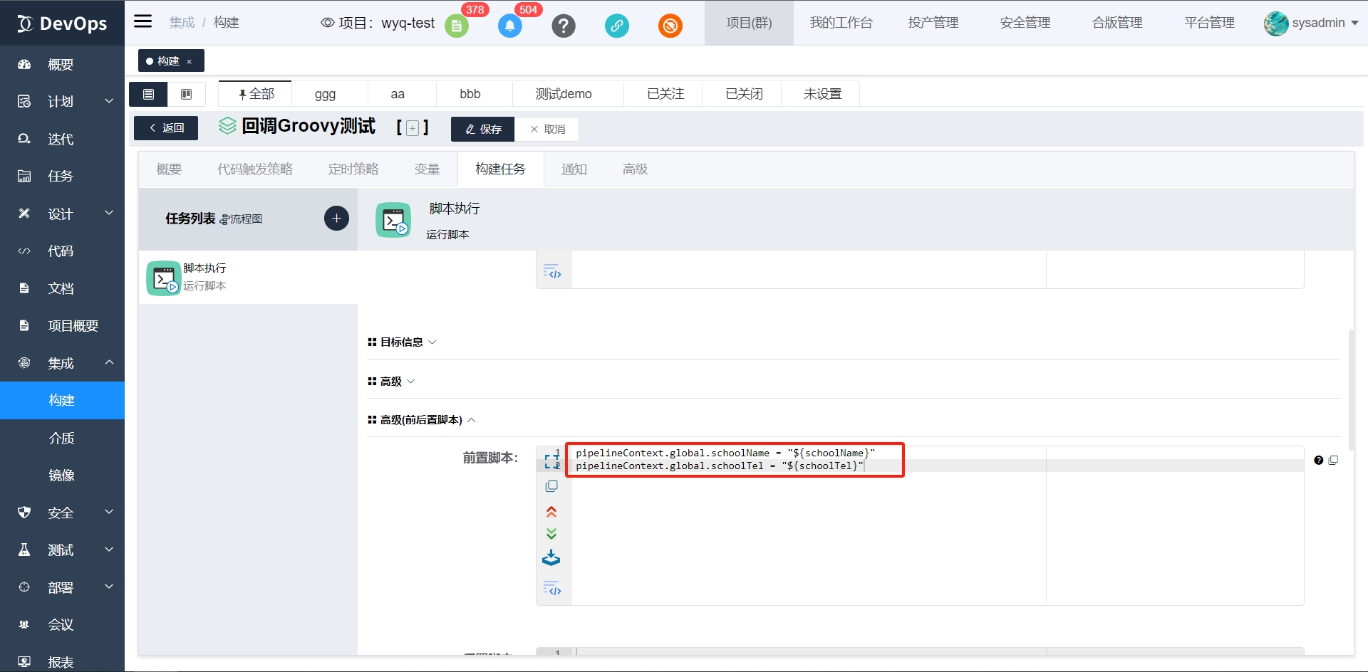 logger.info("************自带属性*****************") logger.info("projectId: ${projectId}") // 当前项目ID logger.info("currentUser: ${currentUser}") // 执行当前流水线的用户名 logger.info("currentDate: ${currentDate}") // 当前时间 logger.info("JsonUtil: ${JsonUtil}") // JSON工具实例 logger.info("logger: ${logger}") // logger日志实例 logger.info("helper: ${helper}") // WorkitemHandlerHelper实例 logger.info("************自带属性,Global中的属性*****************") logger.info("global: ${global}") logger.info("sourceBuildDefinitionName: ${global.sourceBuildDefinitionName}") // 当前构建定义名称 logger.info("sourceBuildDefinitionId: ${global.sourceBuildDefinitionId}") // 当前构建定义ID logger.info("sourceBuildInstanceId: ${global.sourceBuildInstanceId}") // 当前构建实例ID logger.info("sourceBuildInstanceNo: ${global.sourceBuildInstanceNo}") // 当前构建实例编号 logger.info("sourceInstanceStatus: ${global.sourceInstanceStatus}") // 当前流水线状态 logger.info("************自定义变量,从Global中获取*****************") logger.info("schoolName: ${global.schoolName}") logger.info("schoolTel: ${global.schoolTel}")执行结果
