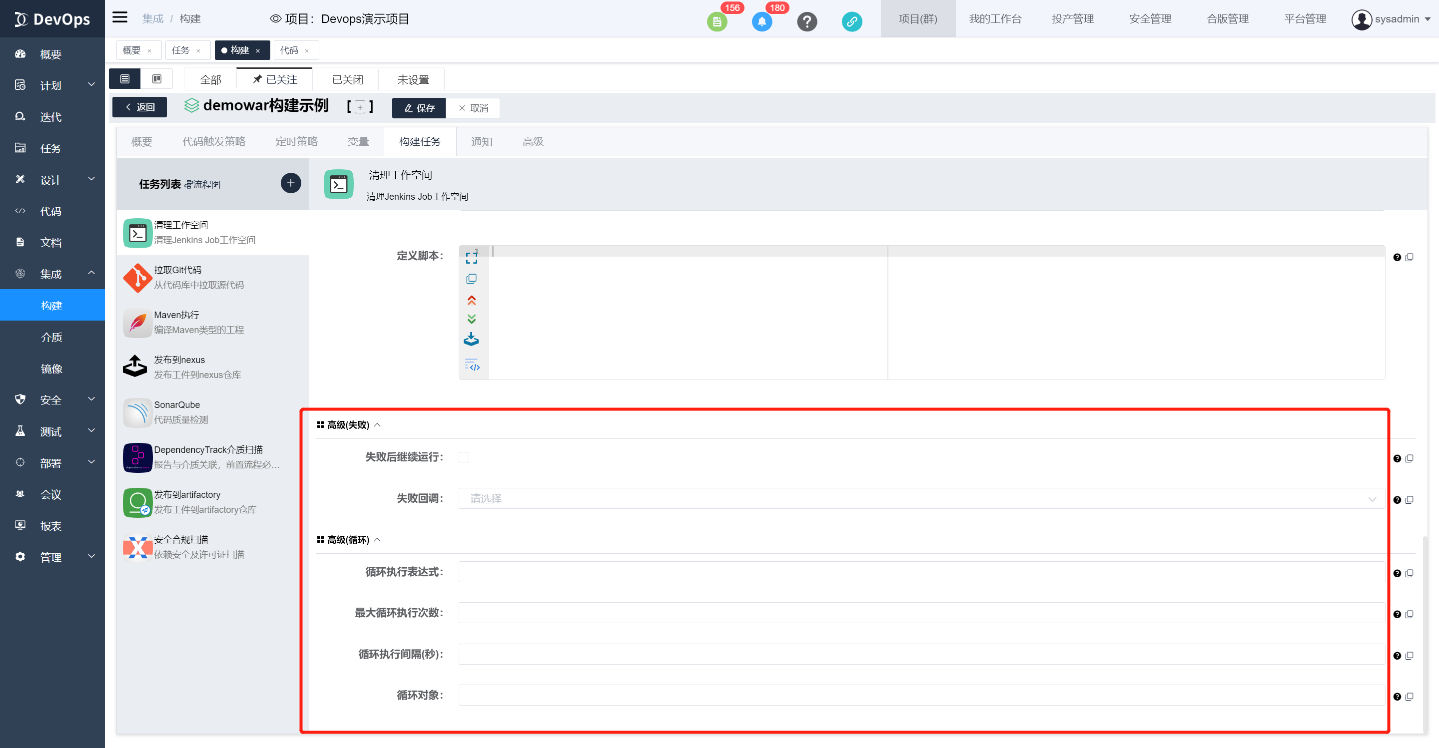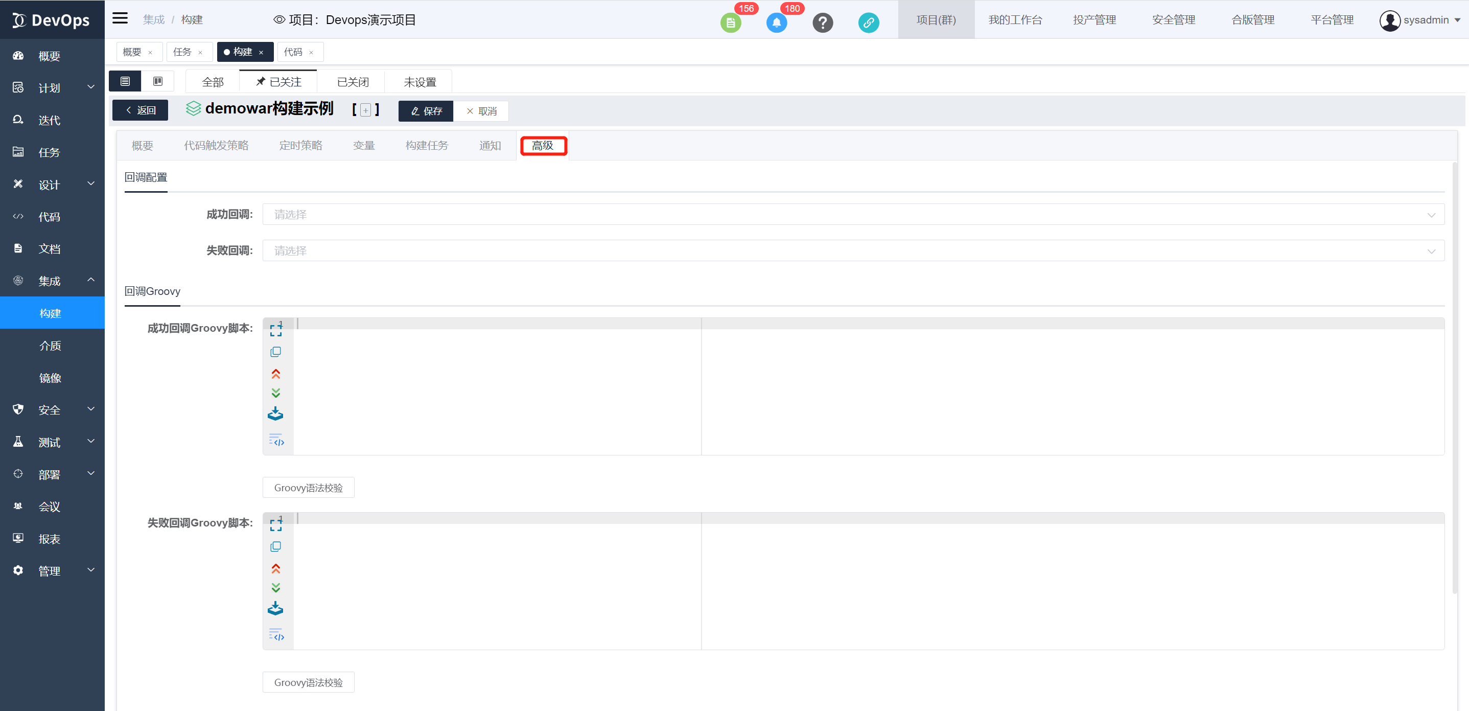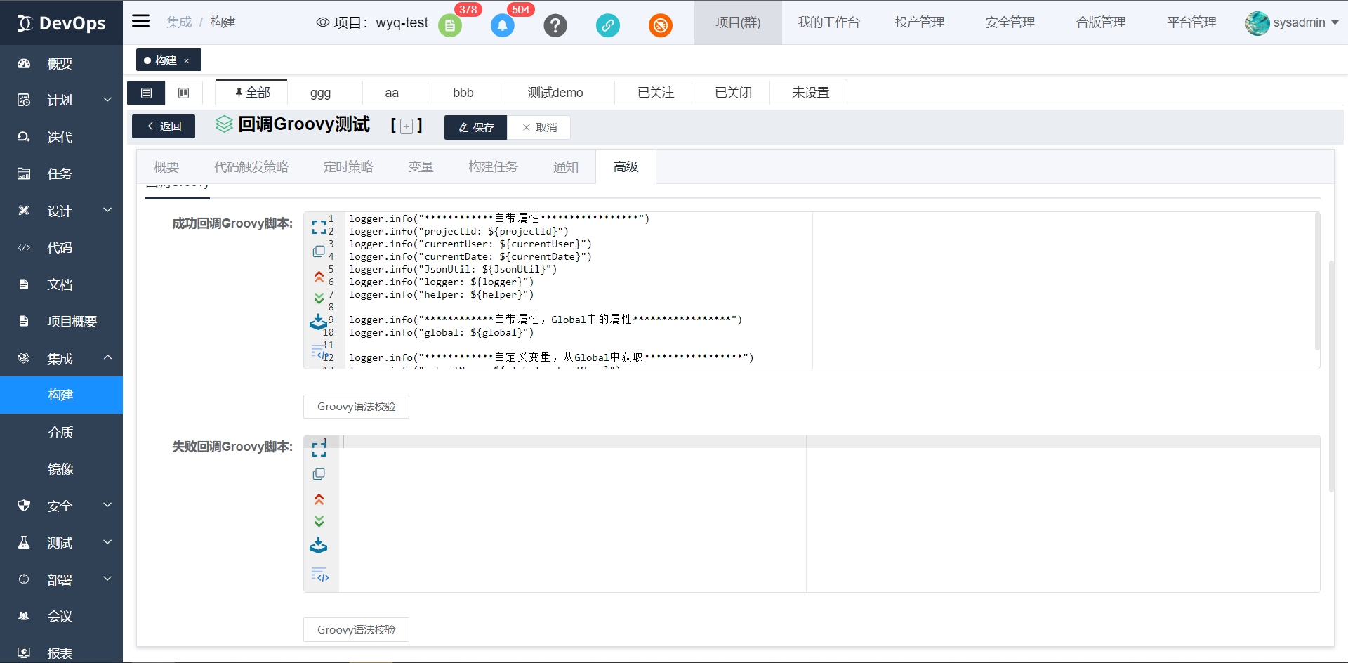 构建定义成功或失败时可以通过回调执行的其他构建定义,也可以配置groovy脚本