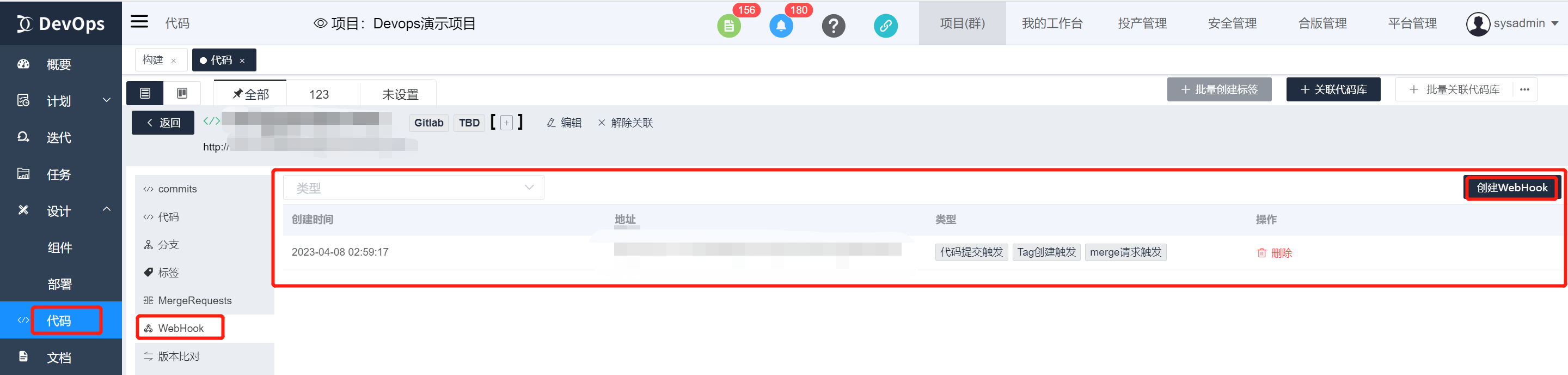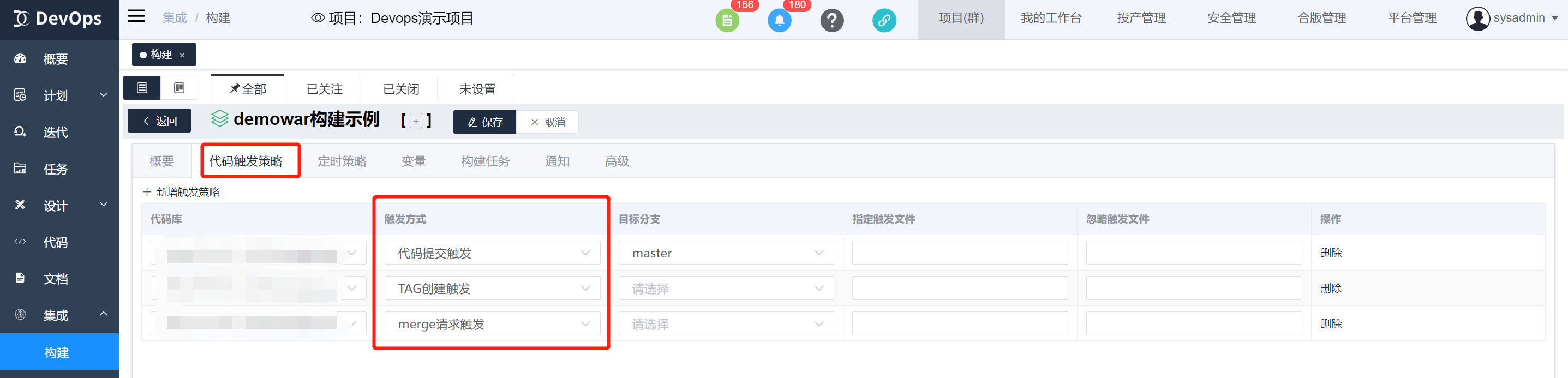 使用代码触发策略的前提是在代码库配置了触发的webhook。