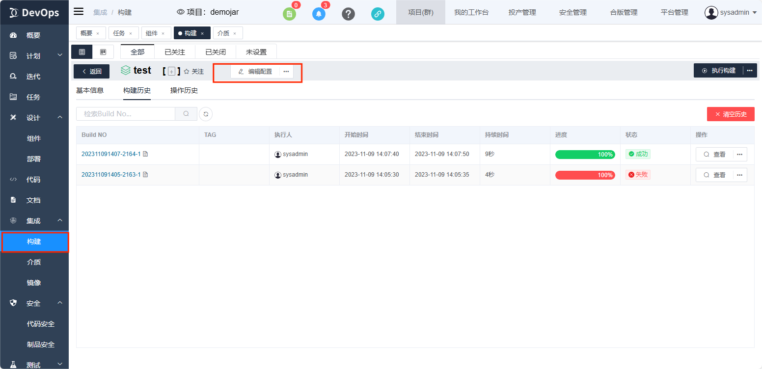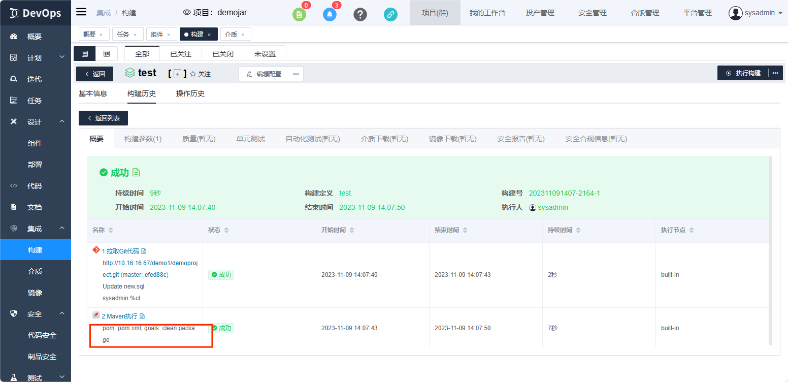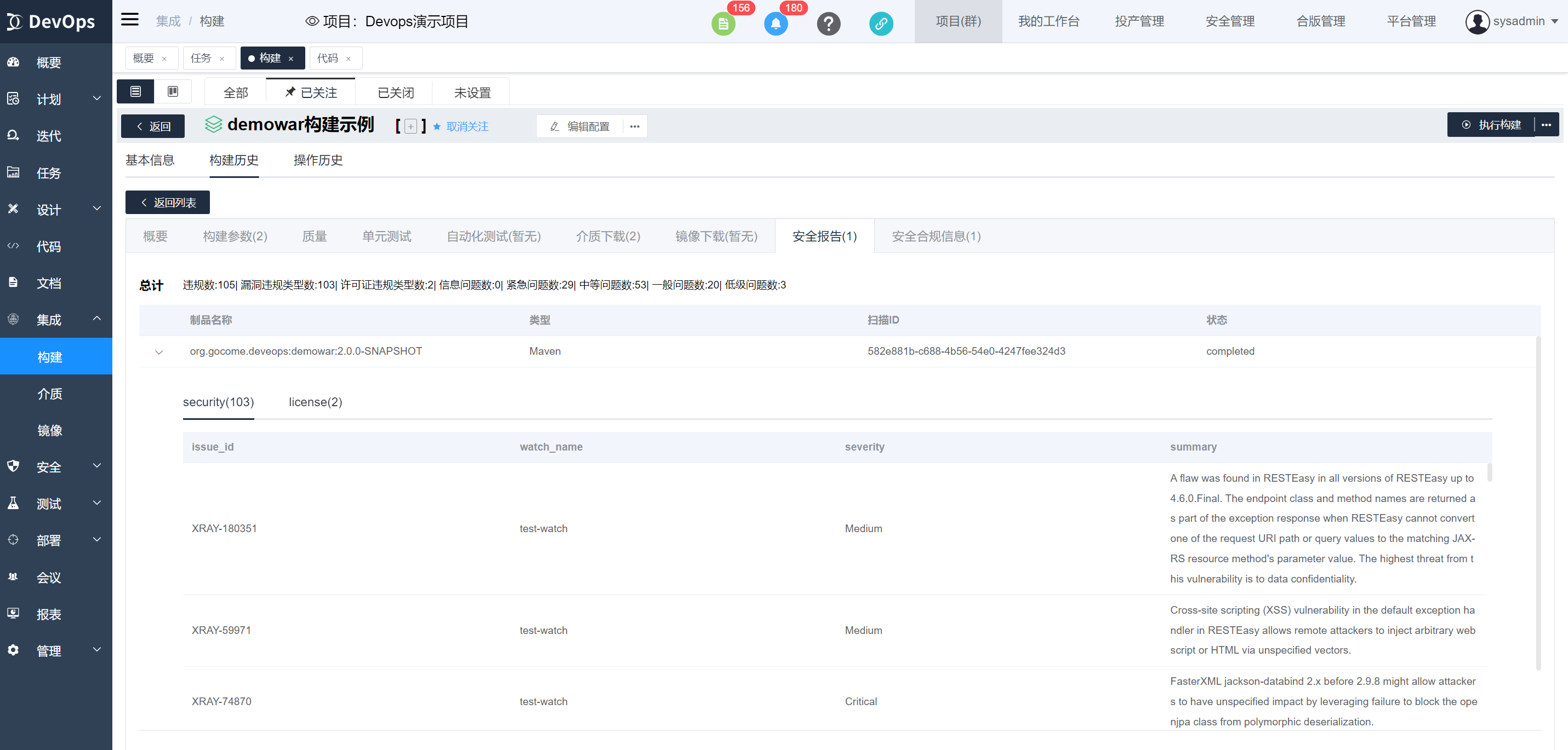 执行xray安全合规扫描,构建执行结束可以在构建历史》安全报告中查看介质质量