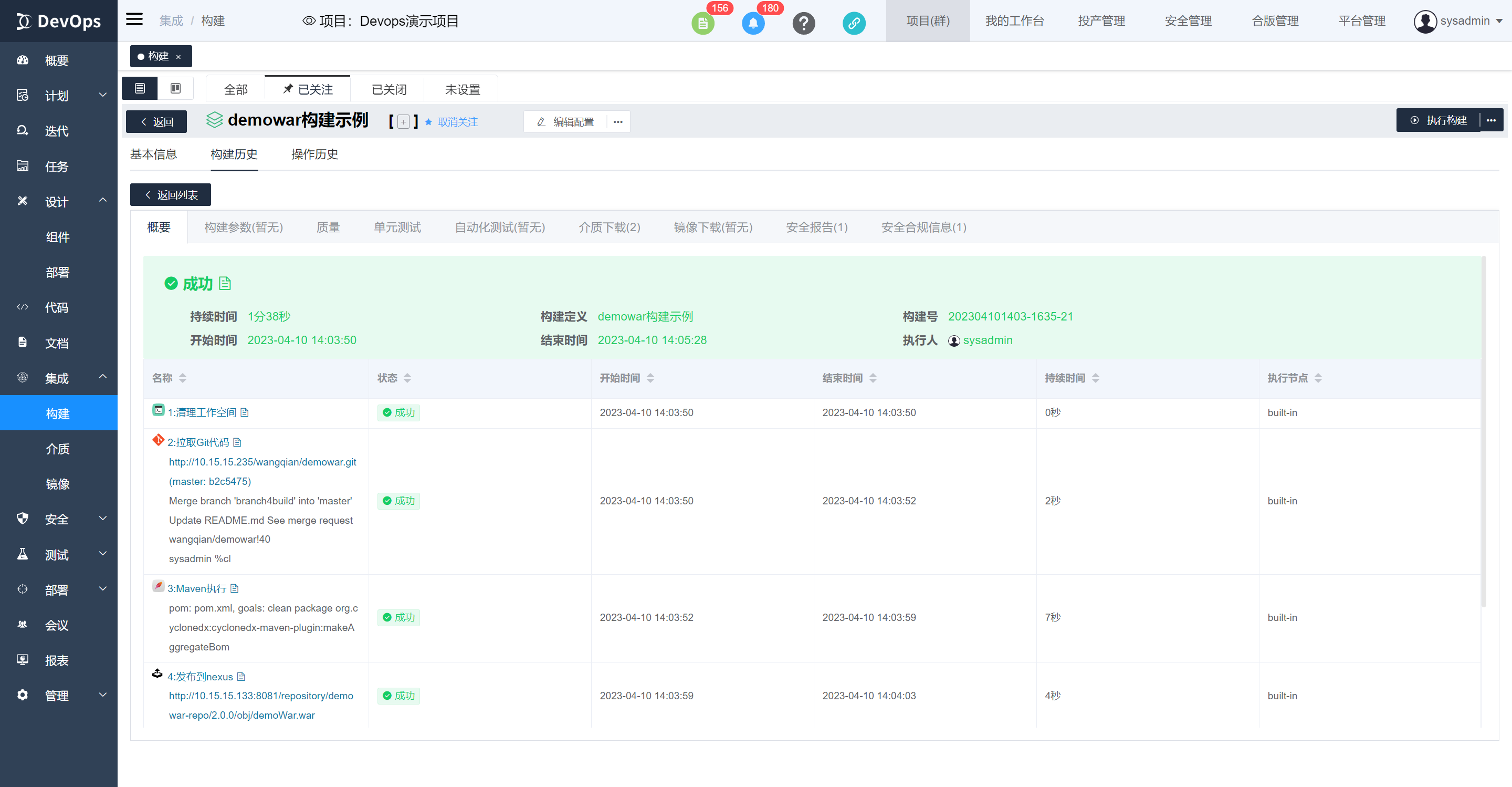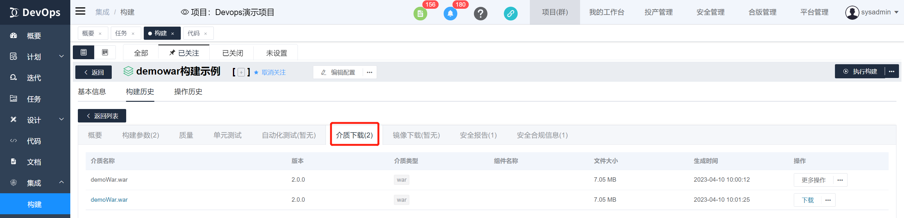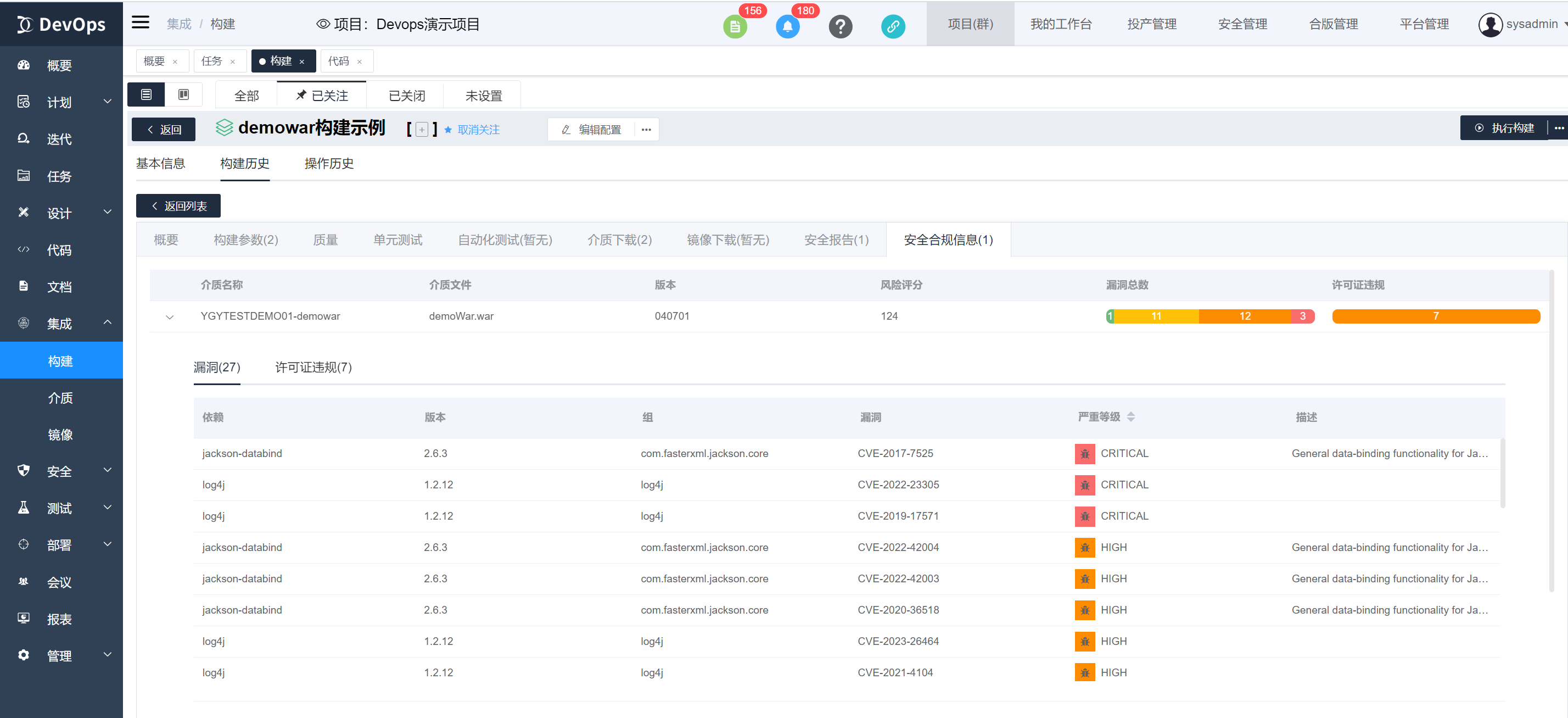 执行xray安全合规扫描,构建执行结束可以在构建历史》安全报告中查看介质质量