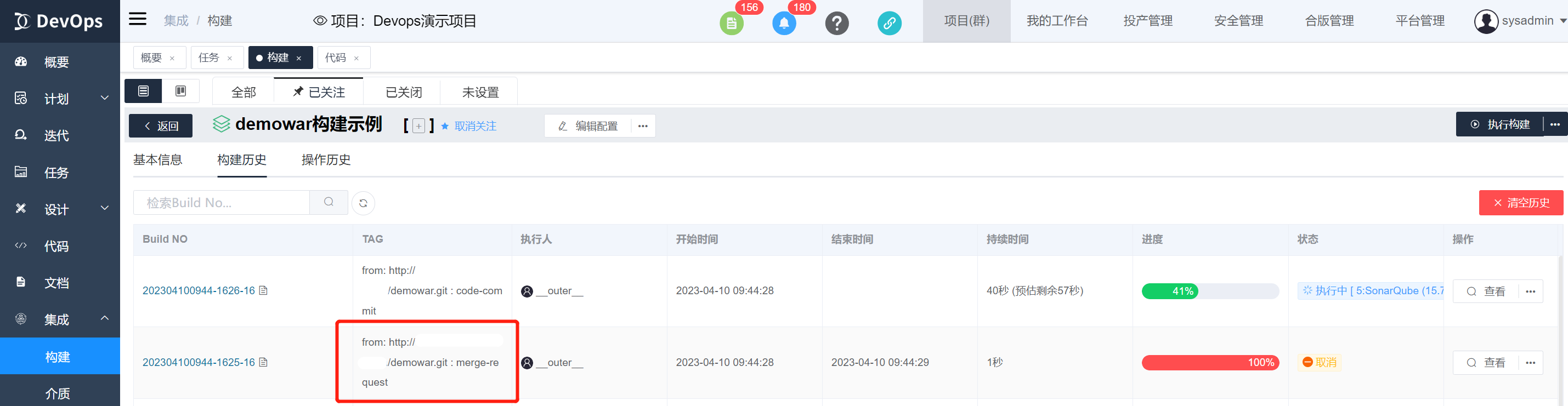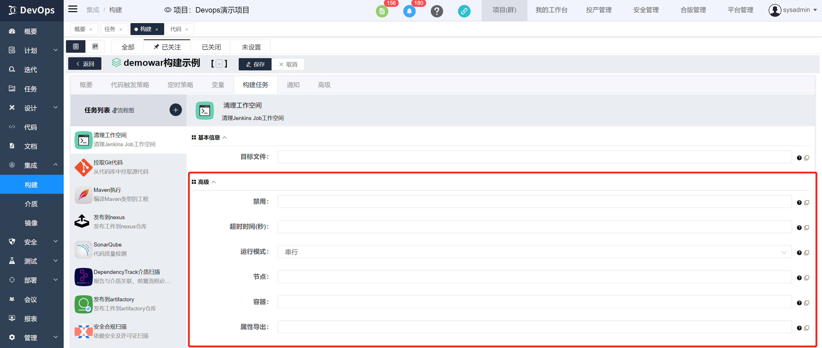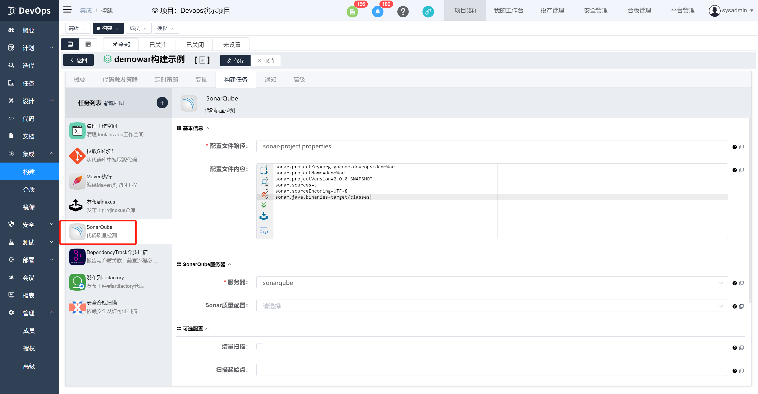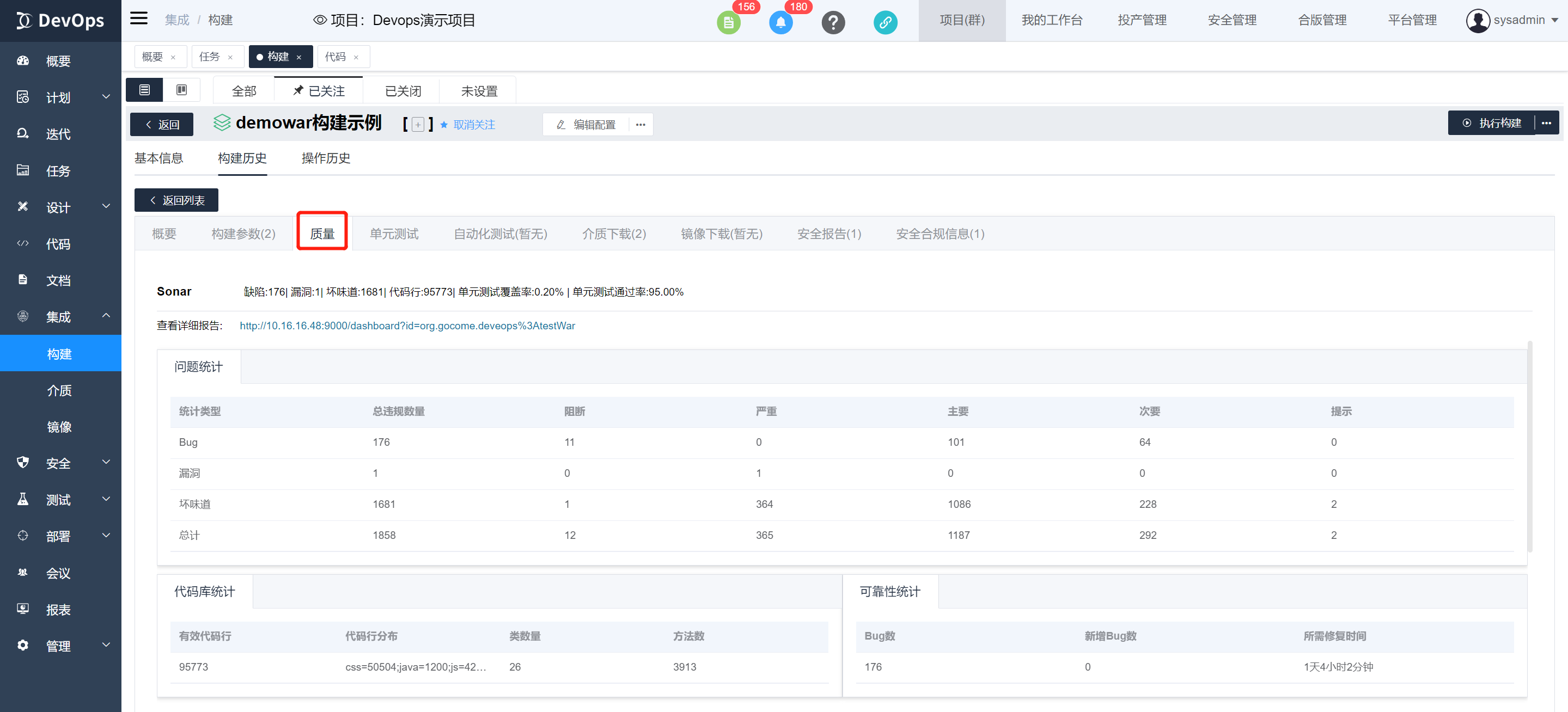 执行sonarqube代码扫描,可以自行配置sonar配置文件内容,不配置将读取目标路径文件,构建执行结束可以在构建历史》质量中查看代码质量报告