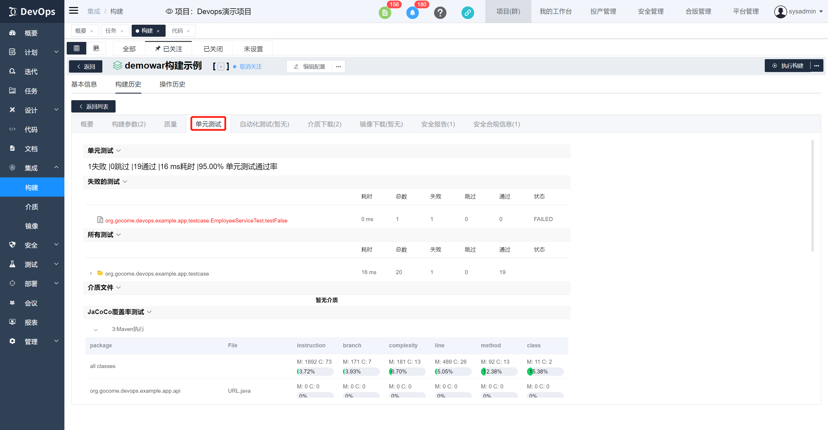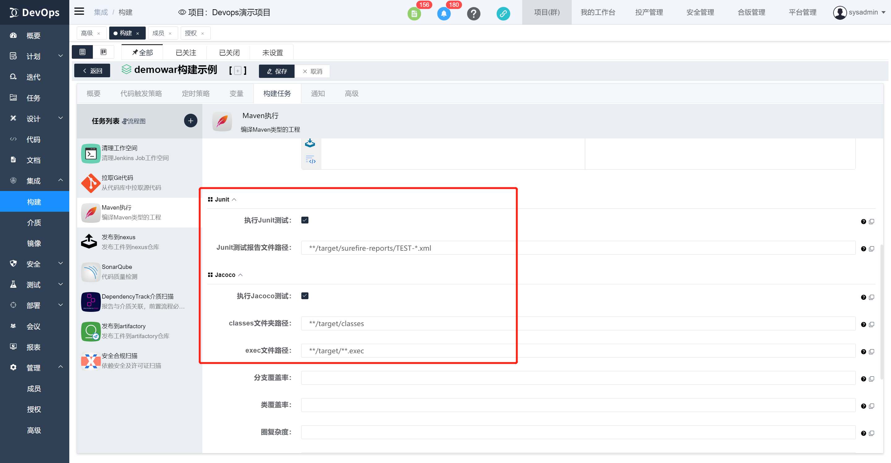 勾选Junit和Jacoco测试,前提是代码库中pom文件添加了对应的依赖,构建执行结束可以在构建历史》单元测试中查看单元测试报告