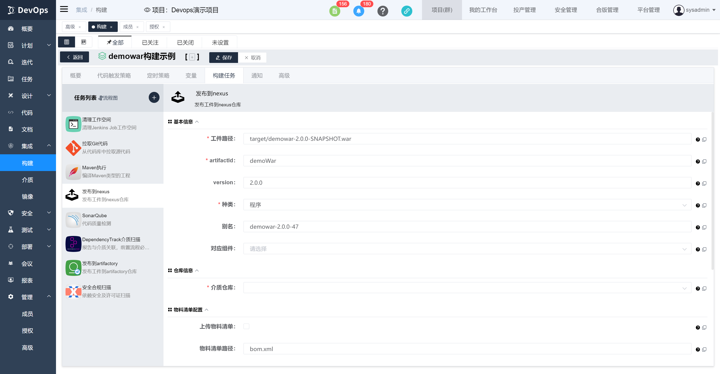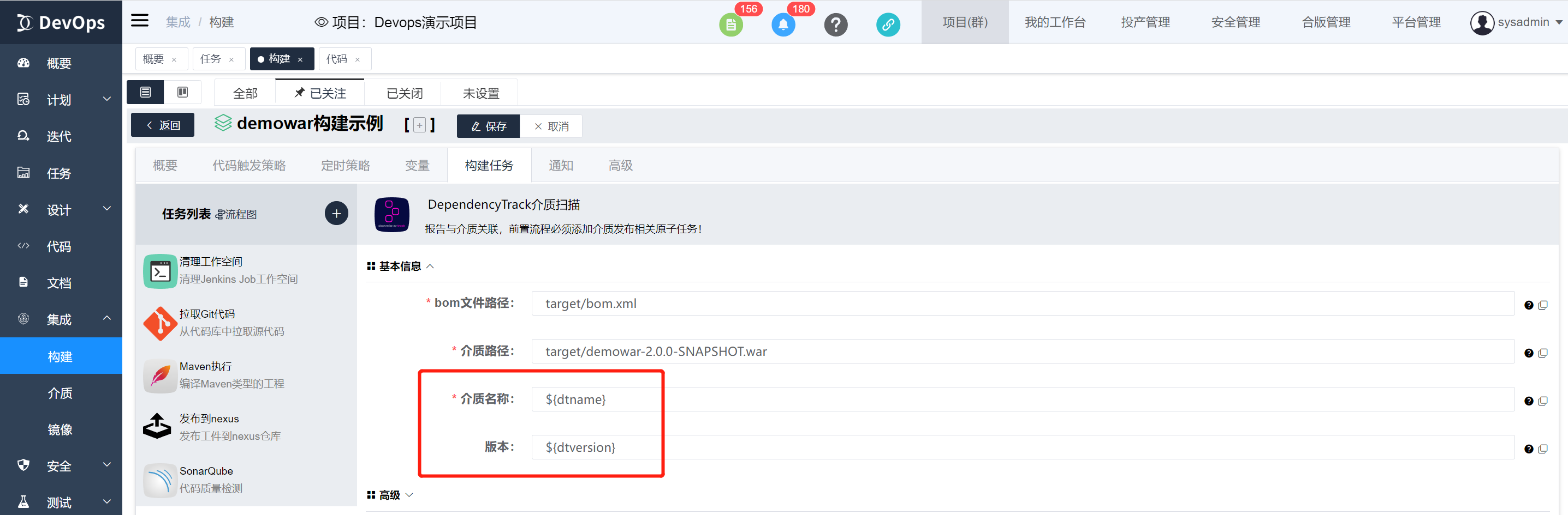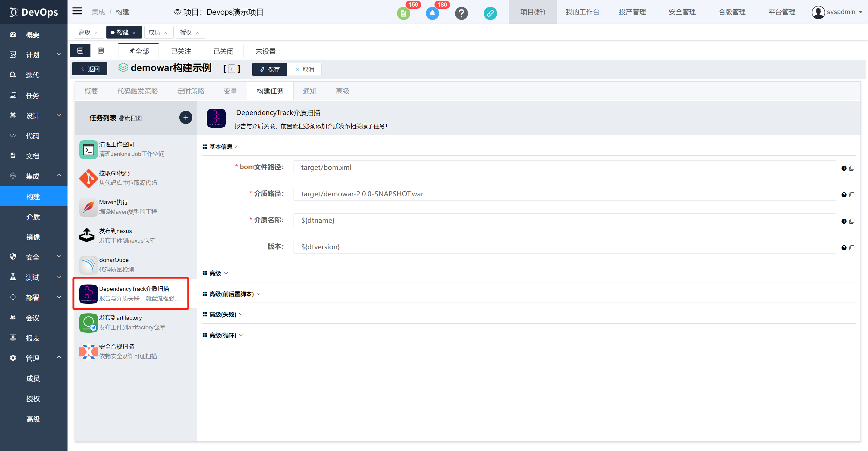 执行DependencyTrack介质扫描,bom文件有maven构建原子任务生成,也可以代码库中包含,然后在此指定文件位置。构建执行结束可以在构建历史》安全合规信息中查看物料清单质量