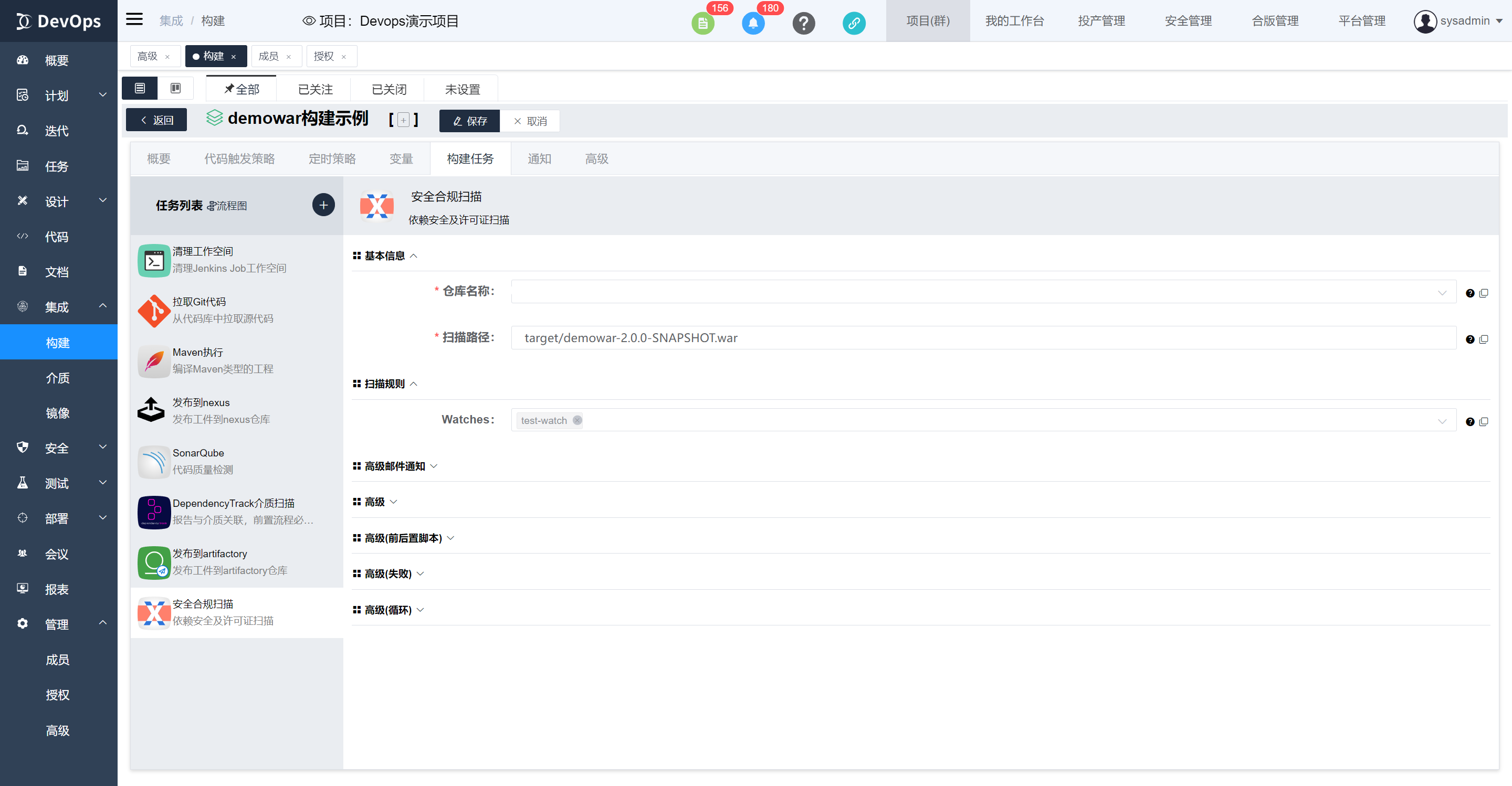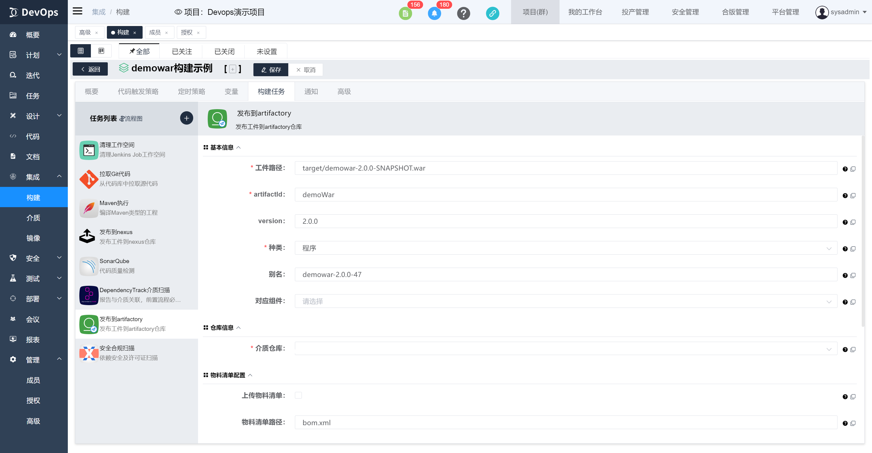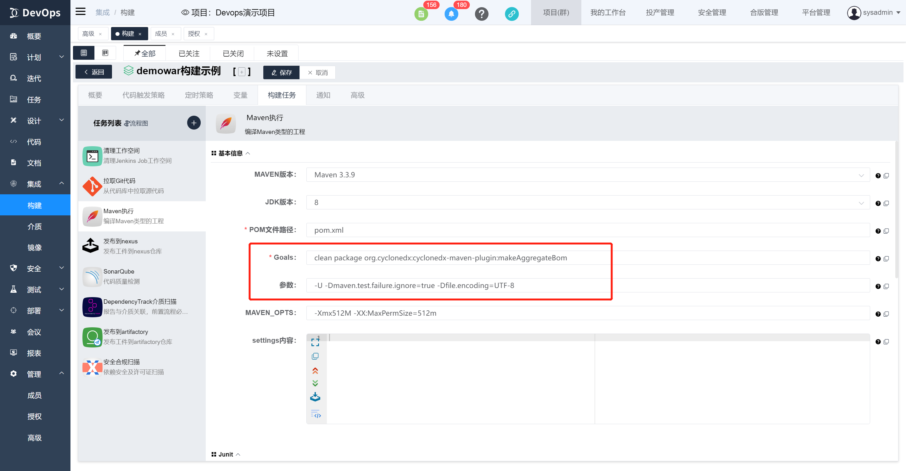 执行DependencyTrack介质扫描,bom文件有maven构建原子任务生成,也可以代码库中包含,然后在此指定文件位置。构建执行结束可以在构建历史》安全合规信息中查看物料清单质量
