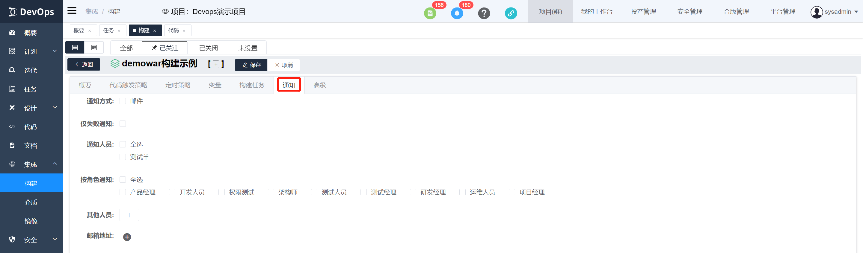 位置:构建定义编辑配置 通知