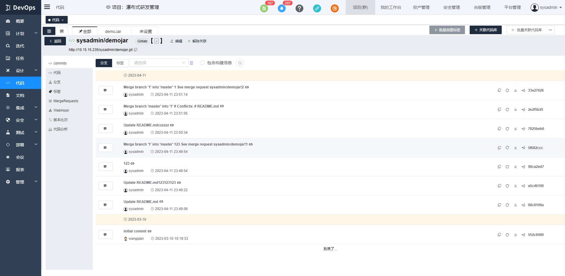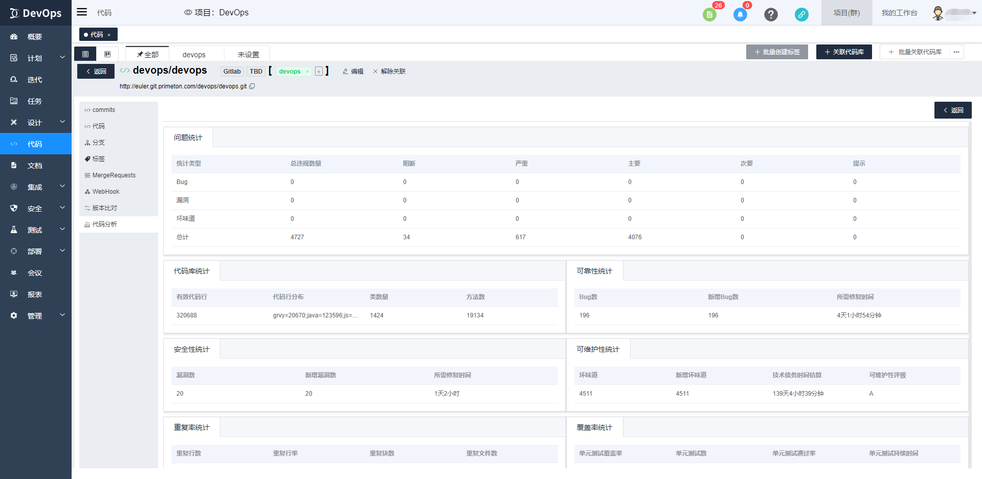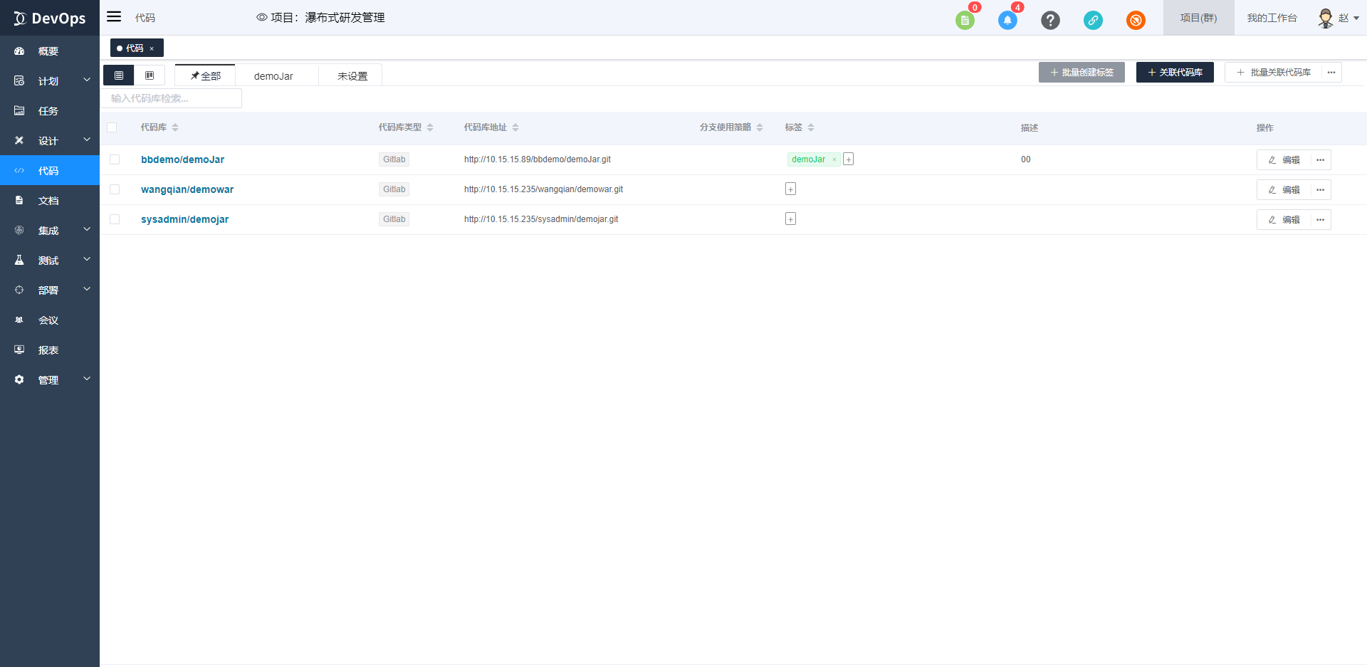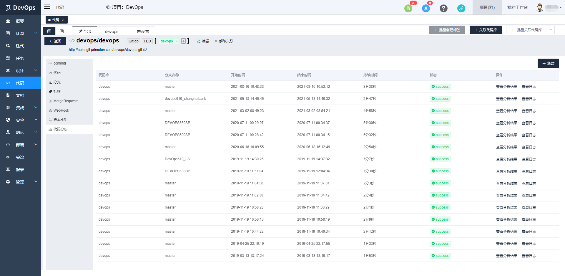 DevOps项目管理中的代码库模块支持将Gitlab、Gihub、Bitbucket、Svn、Tfs关联至项目,并集成了高频功能,方便用户对代码库进行管理,支持对代码库打标签。