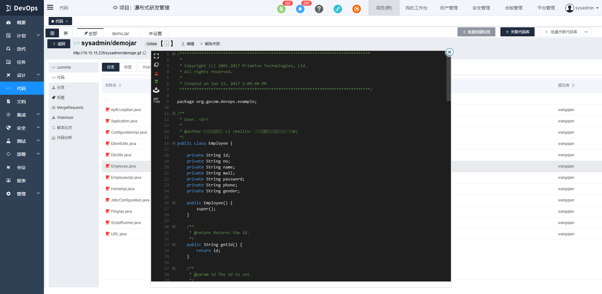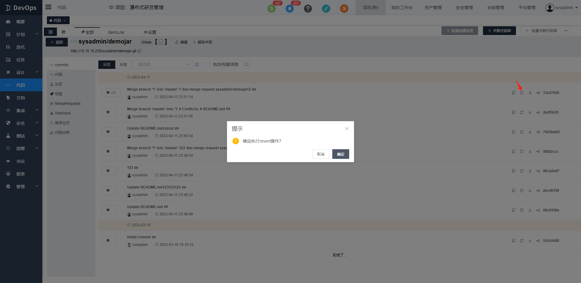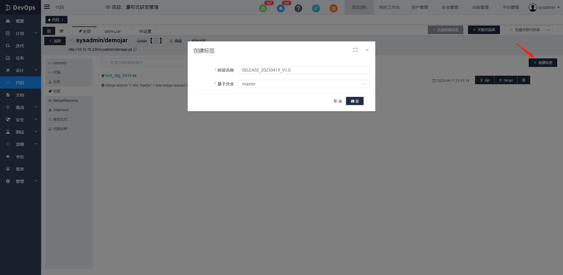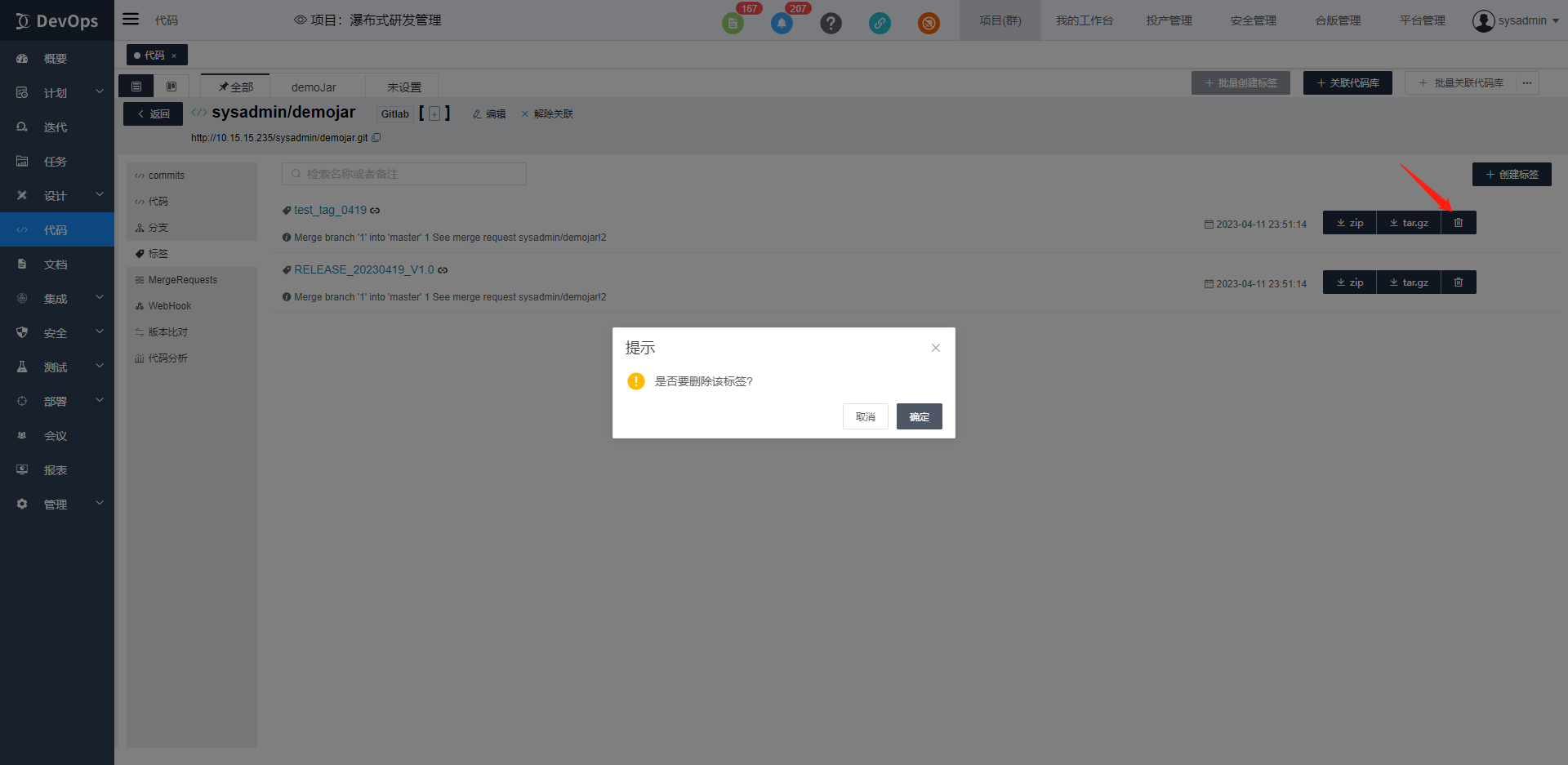 DevOps项目管理中的代码库模块支持将Gitlab、Gihub、Bitbucket、Svn、Tfs关联至项目,并集成了高频功能,方便用户对代码库进行管理,支持对代码库打标签。