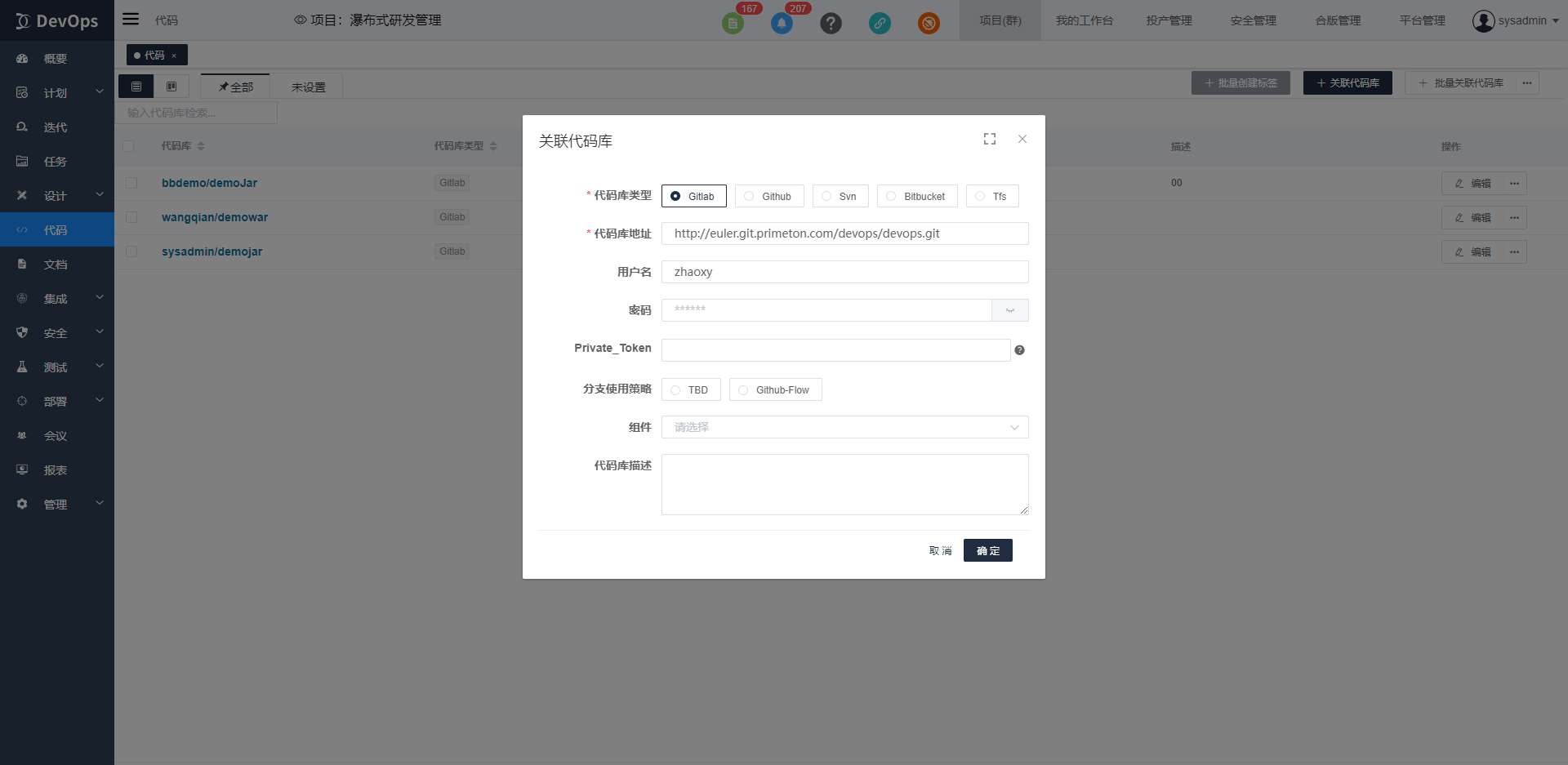 项目负责人需要在项目的设计阶段初始化好代码库,并将代码库关联至项目,支持批量关联,此处配置的账号密码作为后续CI流水线执行拉取代码任务时的认证账号,此处配置的Private_Token作为后续流水线代码类别任务代码服务器接口调用token。