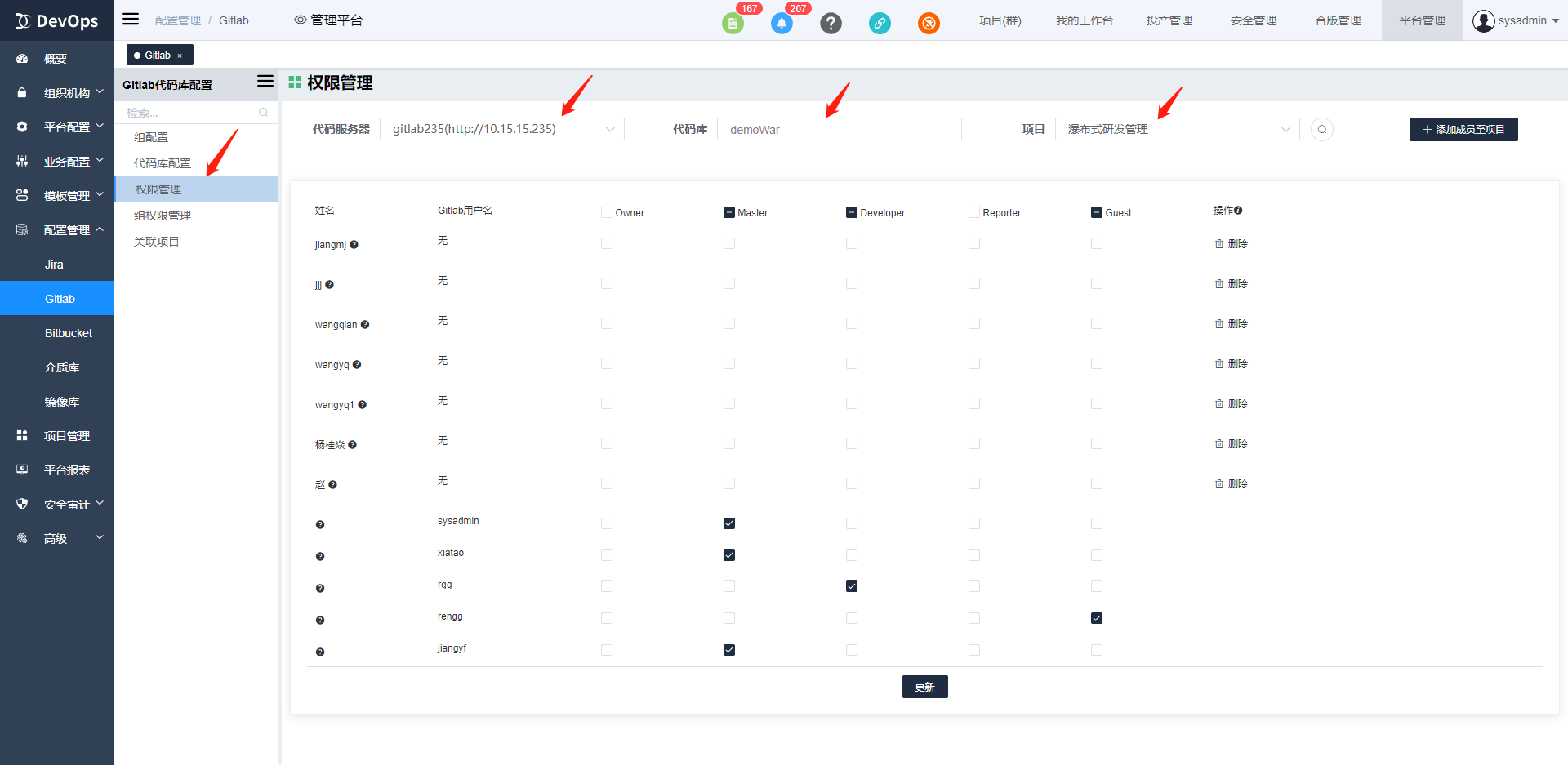在Gitlab权限配置页面,配管需要正确选择代码服务器、代码库以及DevOps的项目,然后授予DevOps项目成员以何种角色加入代码库,Gitlab默认代码库角色有Owner、Master、Developer、Reporter、Guest,点击更新保存DevOps项目成员的代码库权限。