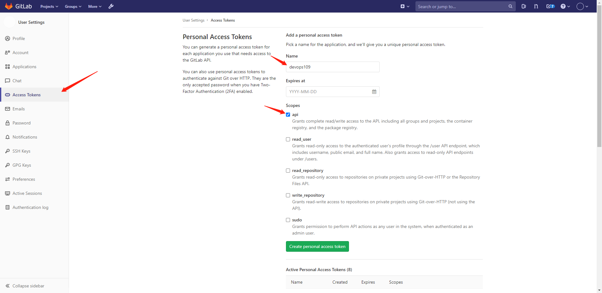 以Gitlab12.4举例,如图,进入Gitlab创建Access_Token页面,勾选api权限,不需要配置时间。