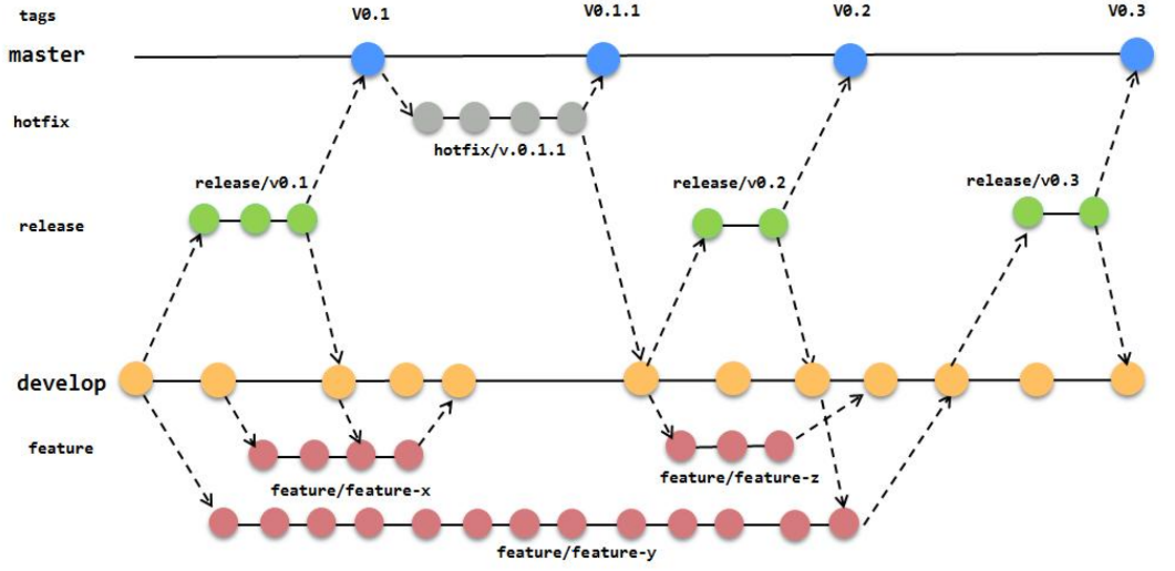 eg. 创建一个dev分支作为开发分支,同时也可在dev分支基础上创建特性分支,特性分支开发完成后合并至dev并销毁。