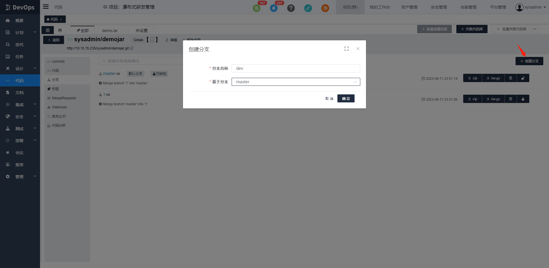 在分支菜单中,项目负责人可以执行新建分支、下载分支源码包、删除分支、锁定分支的功能。