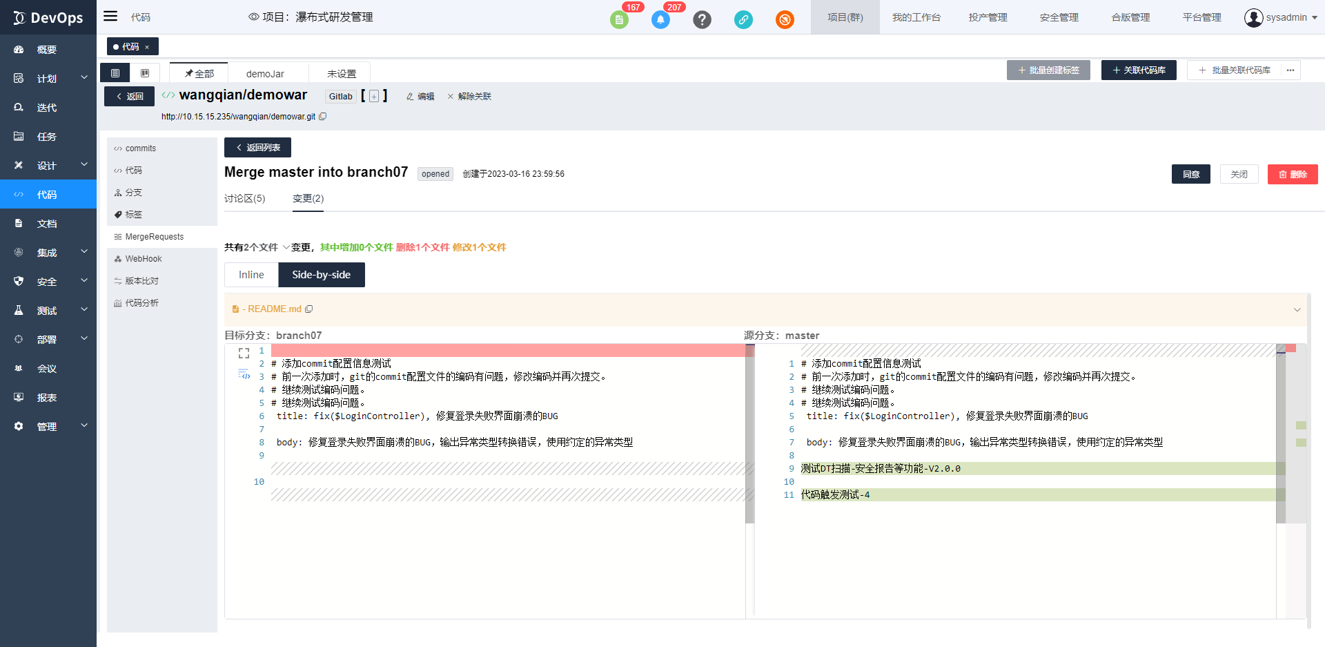 点击合并请求的查看按钮可以浏览合并请求的评论以及详情信息。