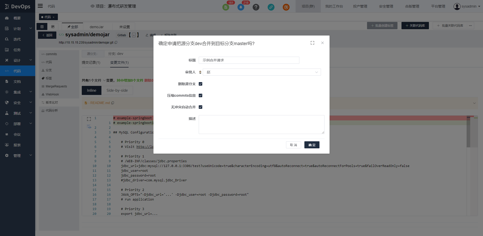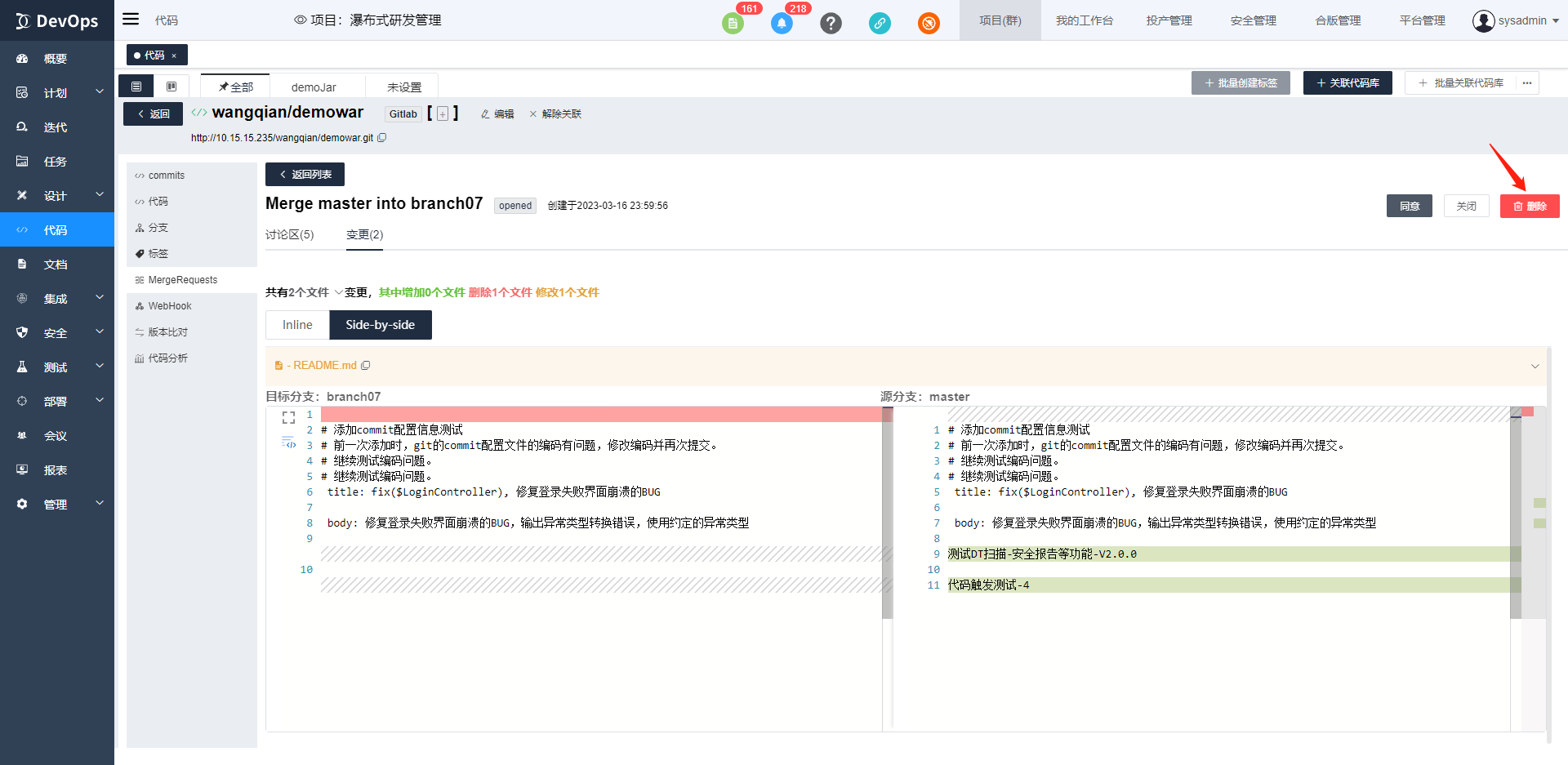 合并请求状态为可合并(代表源码不存在冲突)时,拥有权限的用户可以执行同意合并请求能力来执行代码合并,亦或者拒绝合并,选择关闭合并请求,同样,也可以选择删除创建错误的合并请求。