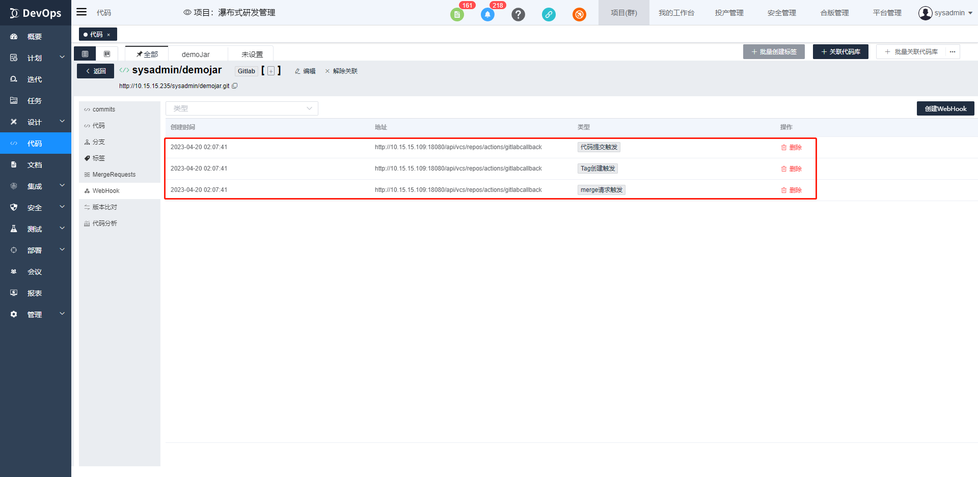 此页面管理当前代码库所有webhook,支持创建和删除。