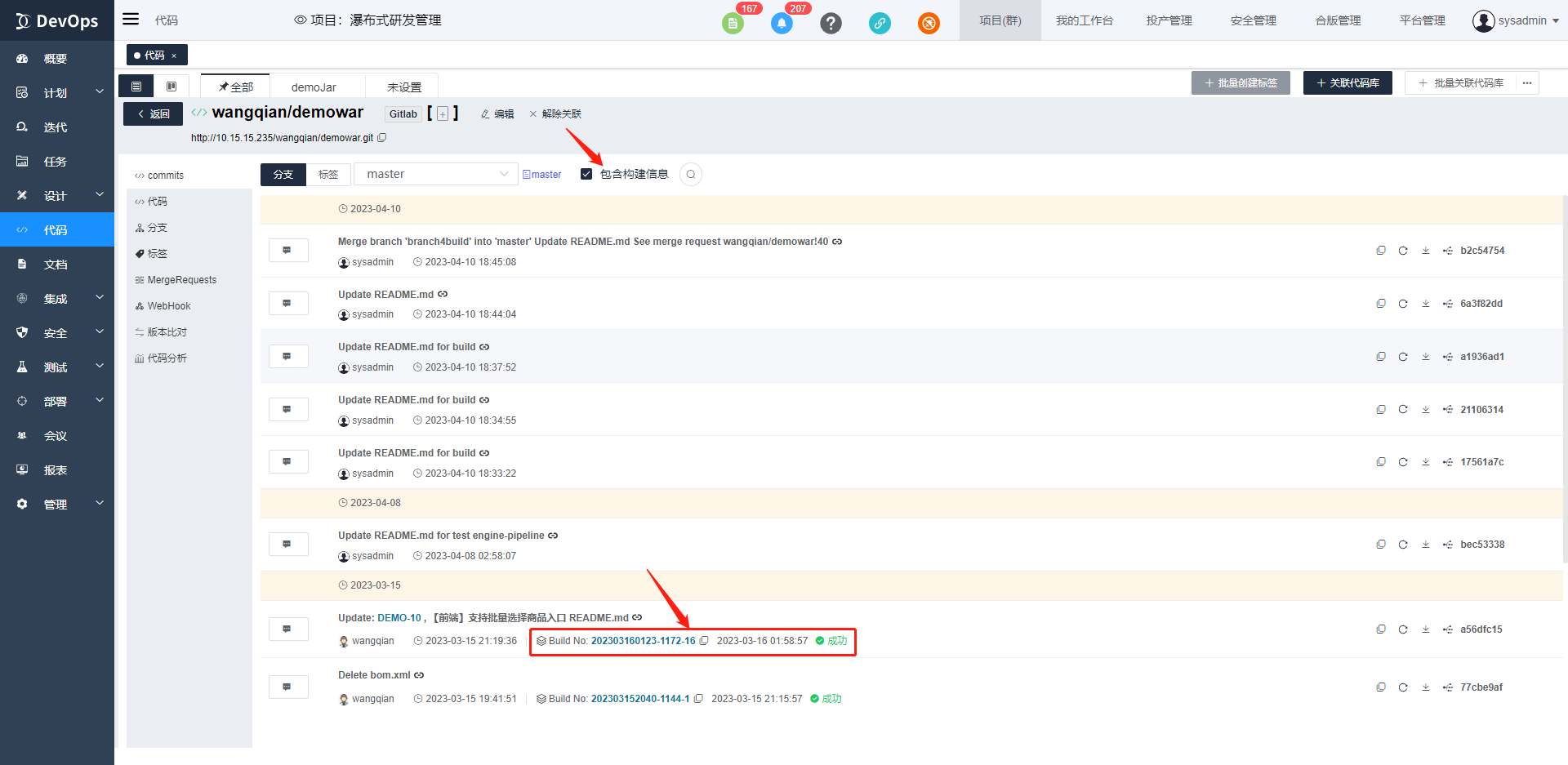 勾选包含构建信息,可以以代码库提交历史记录的角度,了解构建历史信息。