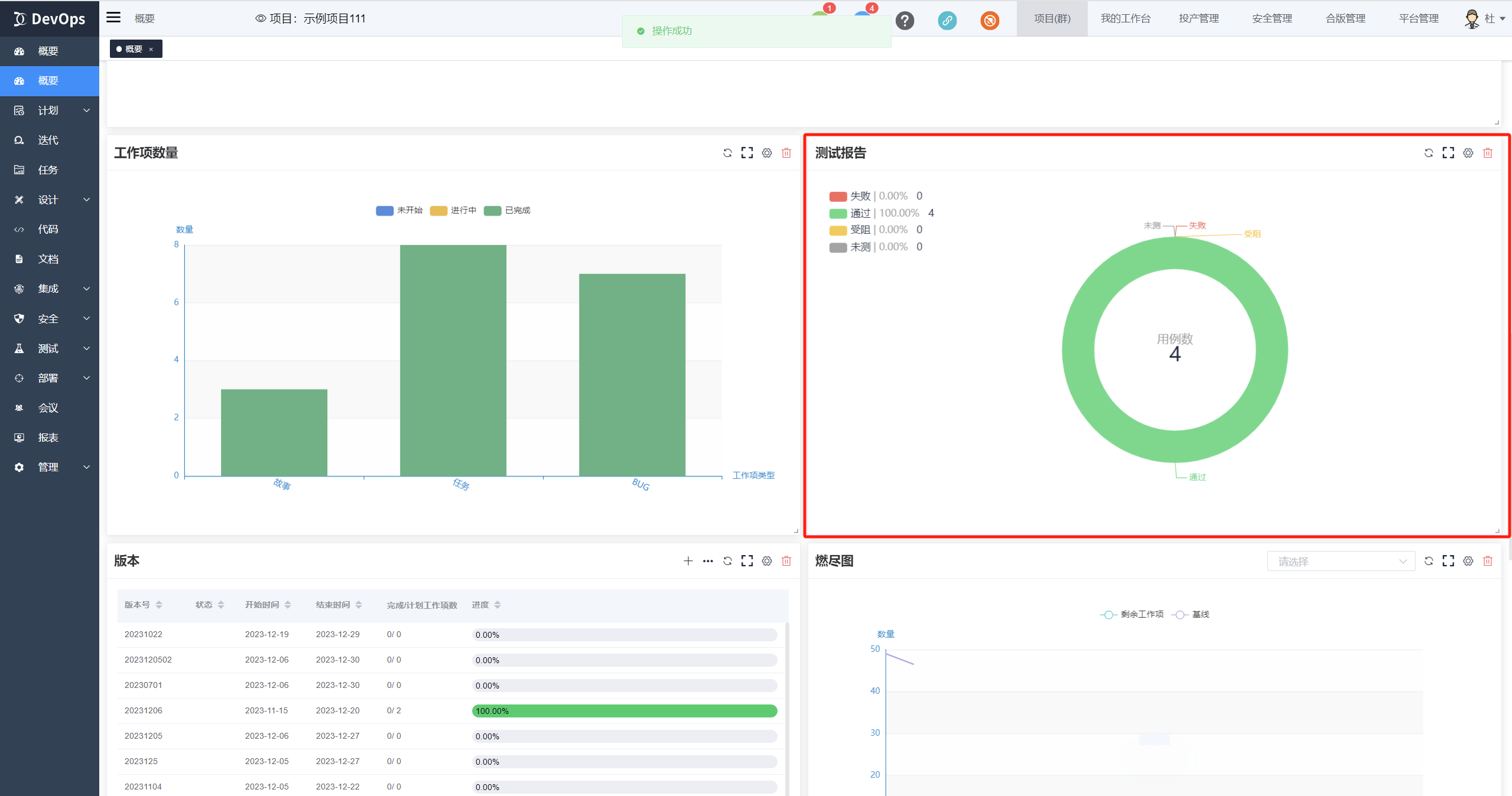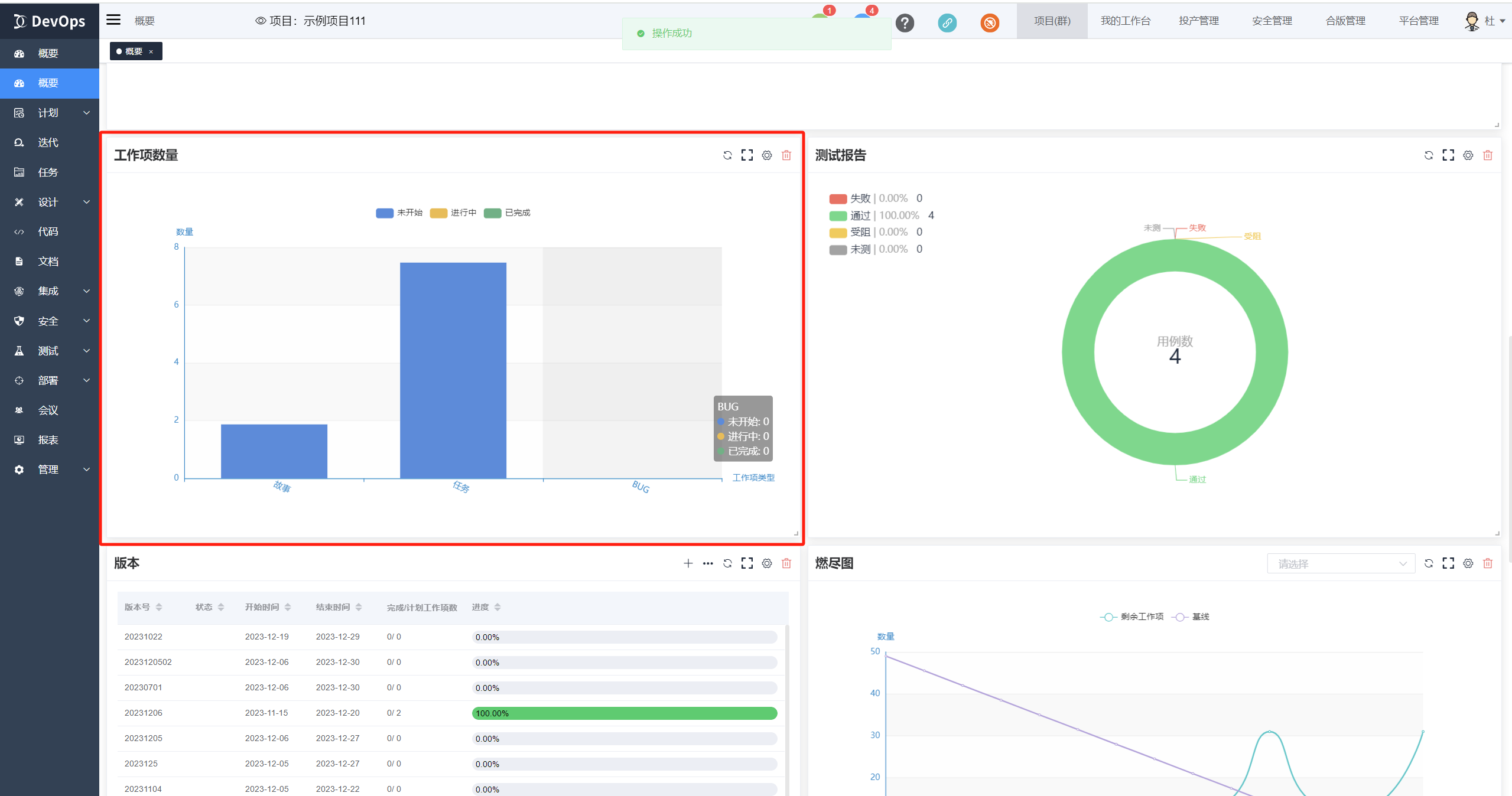 版本: 显示版本的关键数据,比如负责人、工作项进度和计划周期。
