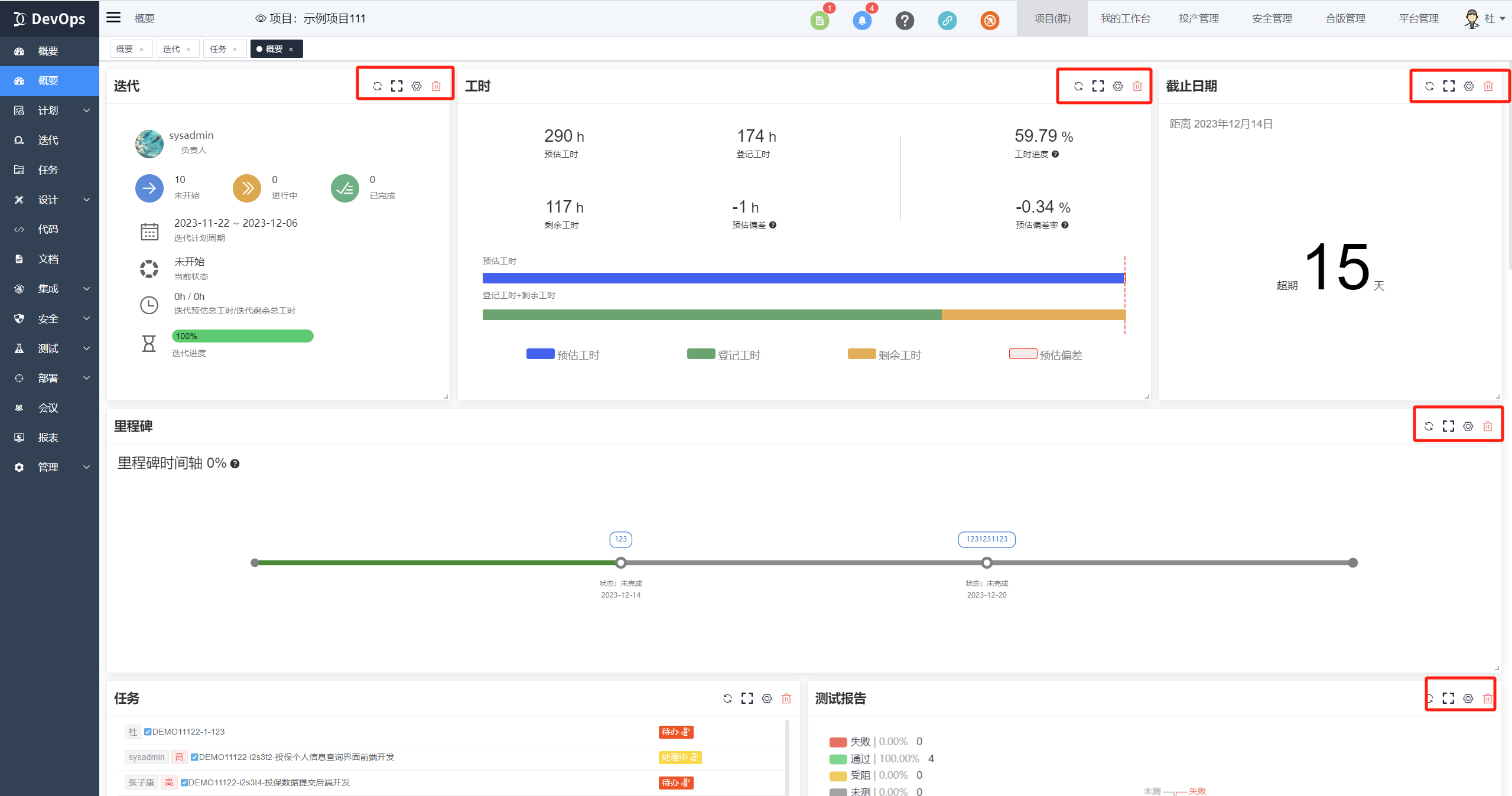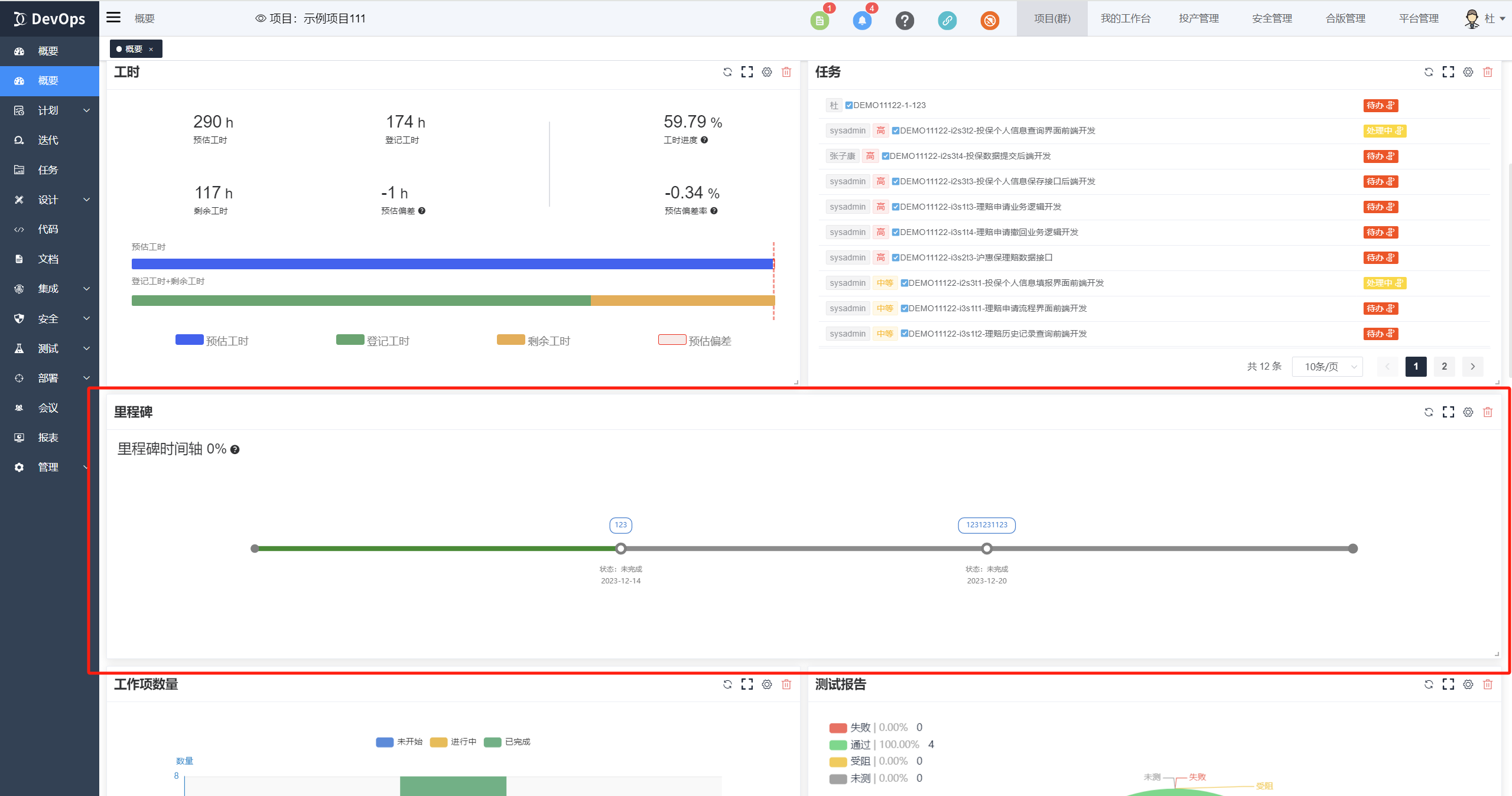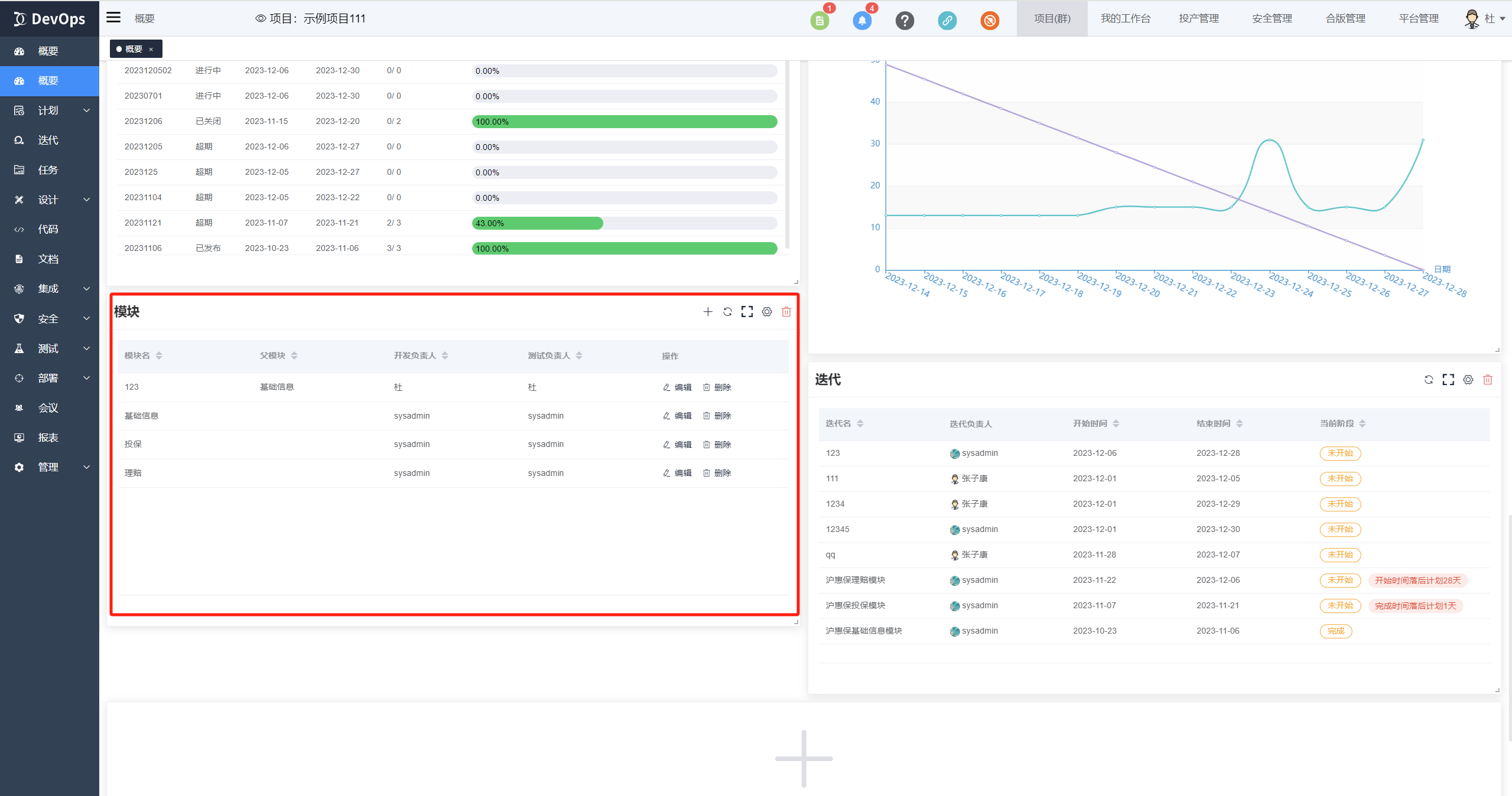 迭代: 显示迭代下的关键数据,比如负责人、工作项进度和计划周期。