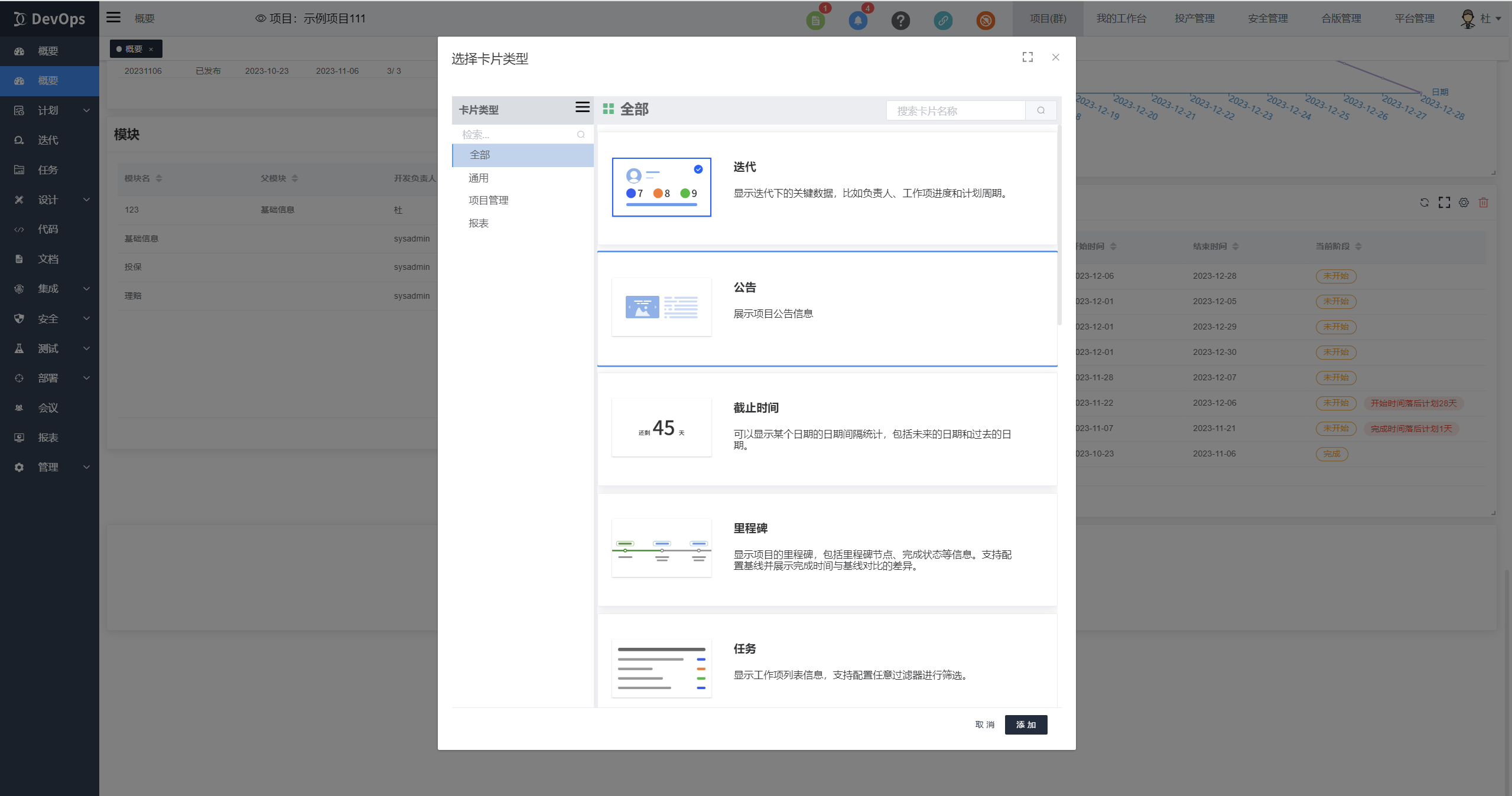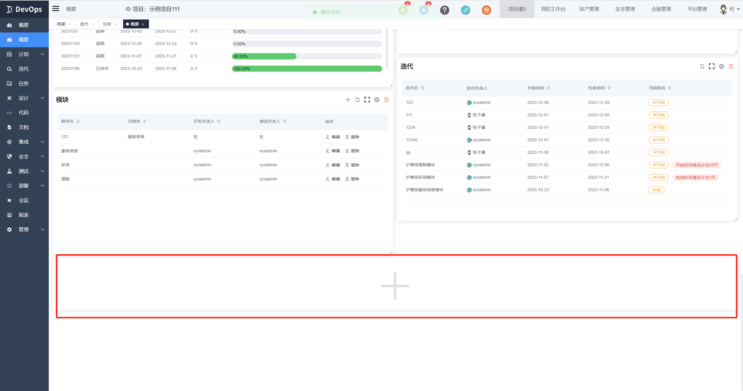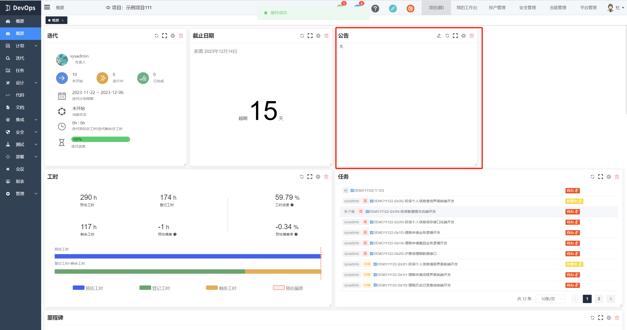 创建好了项目以后,点击项目进入项目概览页面,在该页面项目经理可以维护项目的基本信息,包括项目公告、版本、迭代、模块、风险,这些信息可以让项目成员对项目拥有一个简单直观的了解,首页的风险模块也可以让项目成员更清晰的了解到对当前项目进度产生影响的因素,及时处理风险。