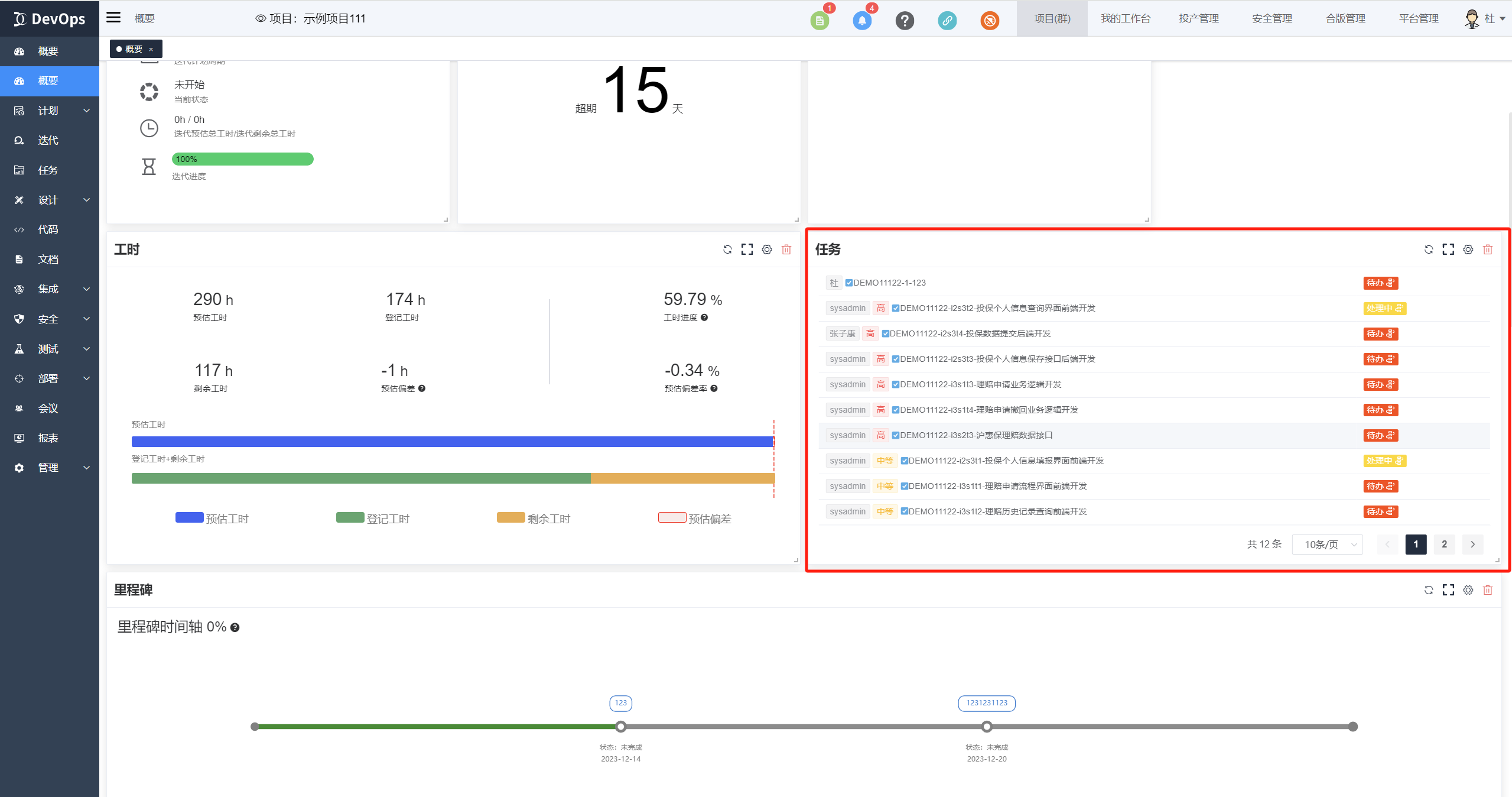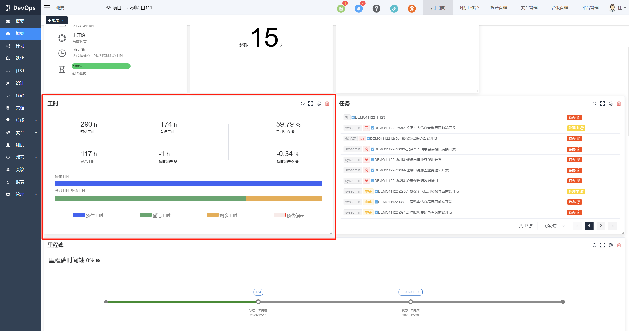 工时: 可以显示项目下总预估工时、总登记工时、总剩余工时、工时进度以及进度偏差。