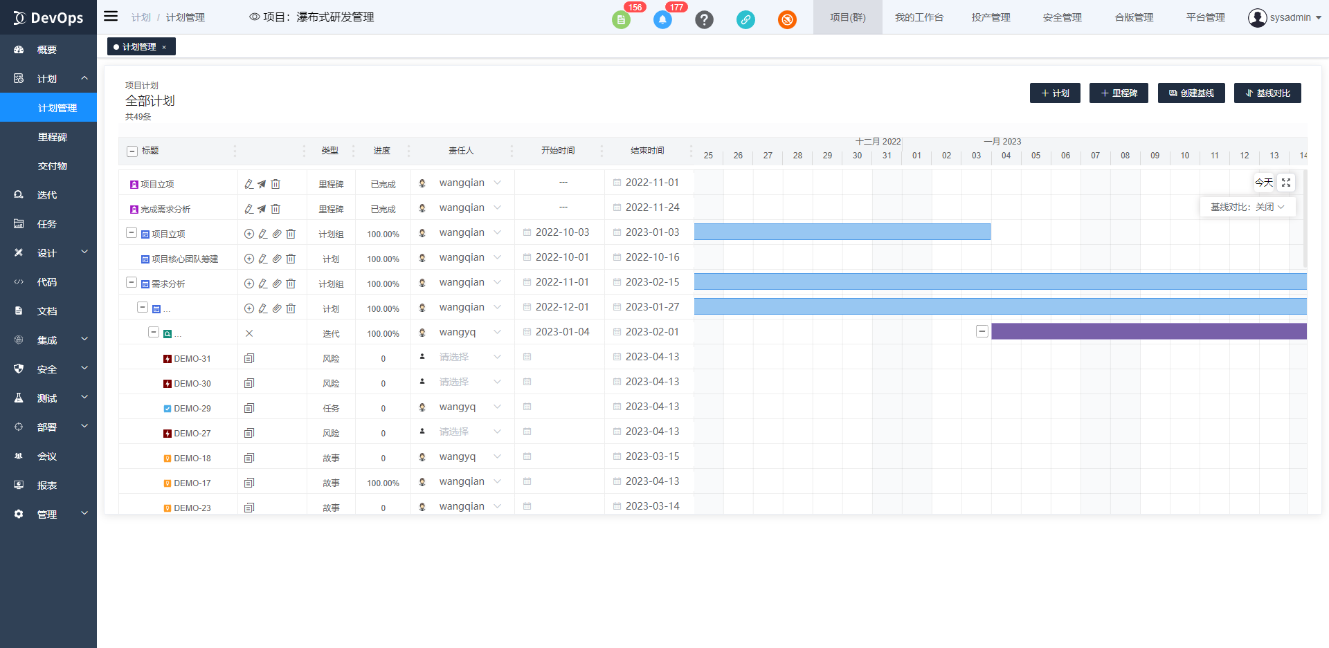 计划管理贯穿整个项目的生命周期,无论是敏捷还是瀑布模式,从立项开始都需要建立计划来把控项目的实施过程,并通过配置计划的开始、结束时间来绘制甘特图,让项目管理人员清晰的了解到计划执行进度。