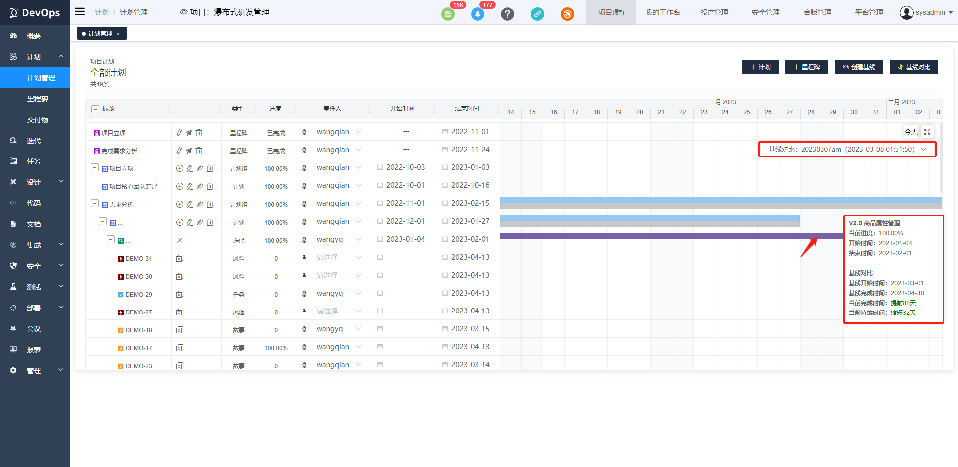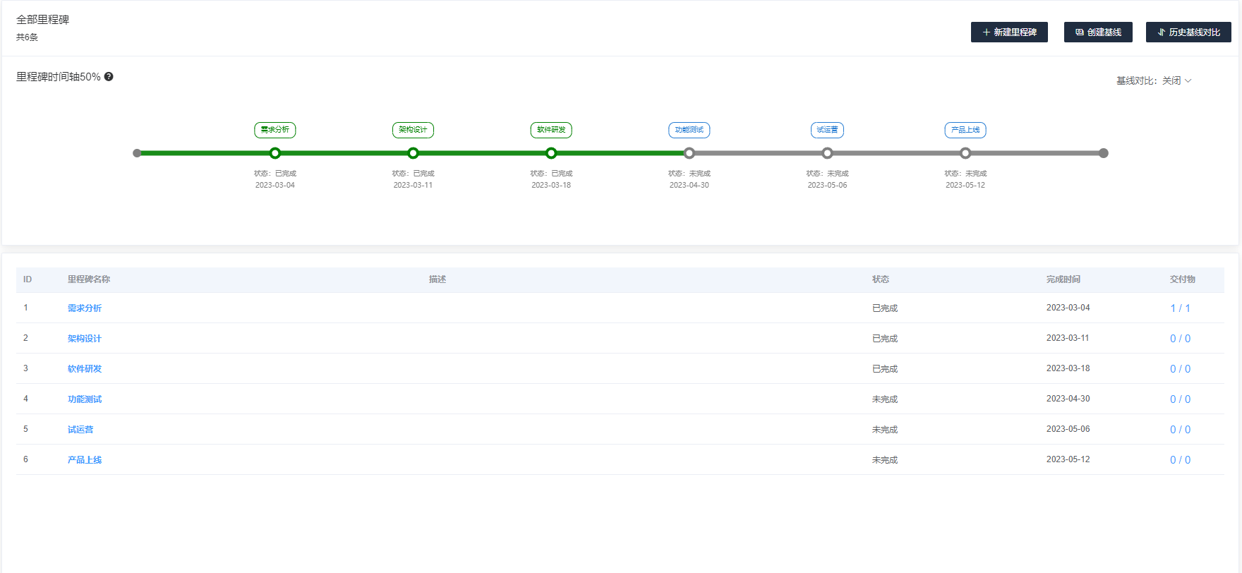 创建好的里程碑节点会同步展示在计划管理页面,方便把控整个项目的进度。