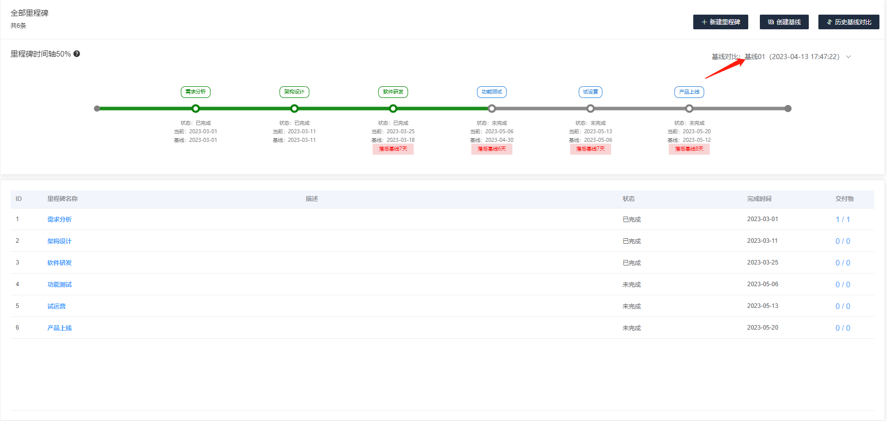 里程碑同样适配基线对比能力,项目管理人员可以根据项目情况创建里程碑基线,方便后续里程碑的完成时间产生变动时进行对比,来确认里程碑节点的提前或者延期完成情况。