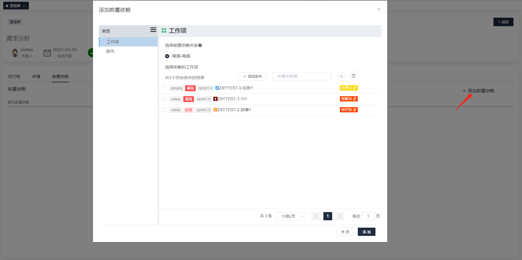 同时可以在前置依赖页面,为里程碑节点的完成条件添加前置依赖,前置依赖分为两种:"工作项"、"迭代",只有完成了所有的前置依赖条件,里程碑节点才可以完成。