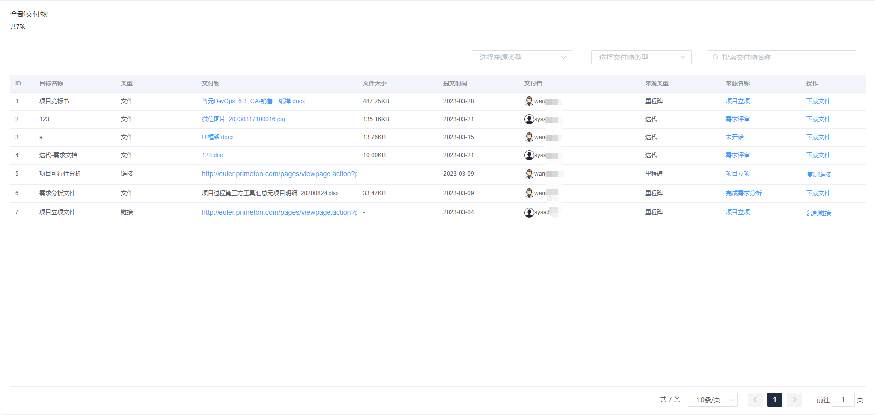 项目成员可以在交付物页面浏览本项目里程碑节点的所有交付物。