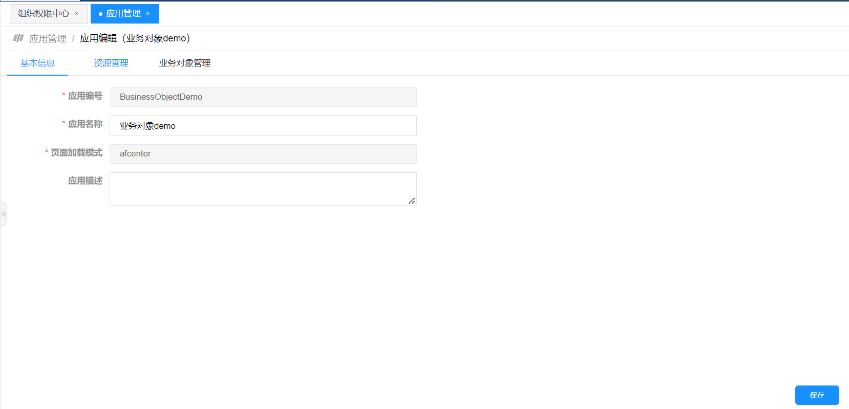 1.创建应用(业务对象demo)-》创建应用功能资源-》创建应用页面资源