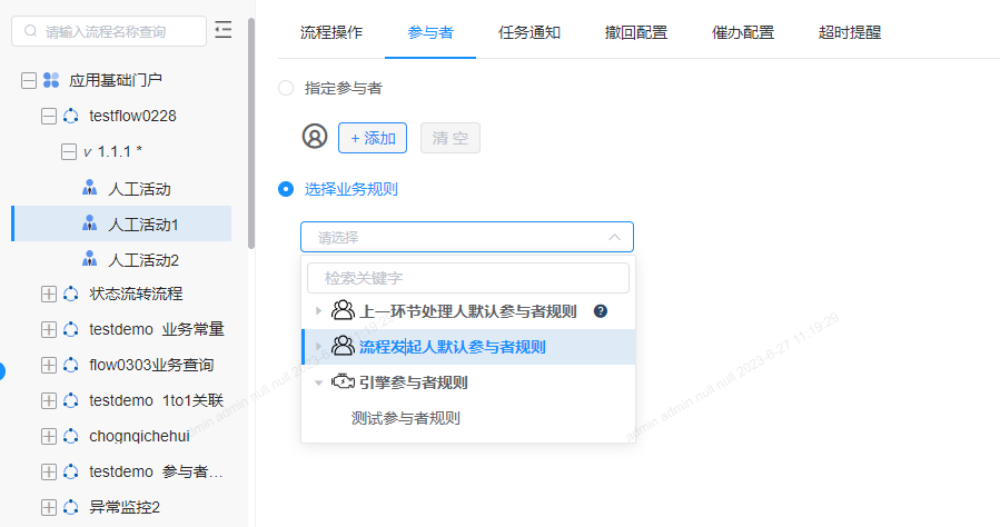 双击第二个人工活动,在弹出的编辑器中点击参与者,点击参与者规则,再点击下拉框,即可根据需求设置该环节的相关参与者规则。