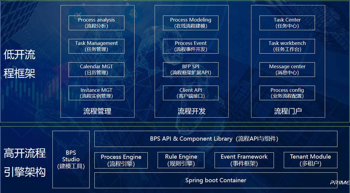 流程框架分为低开流程框架和高开流程引擎框架两部分。在低开流程框架中,封装了流程管理、流程开发和流程门户相关功能,基本满足流程开发、运行和管理的流程全生命周期的功能。同时,如果还有特定的业务场景在低开流程架构中无法满足,那么我们就可以在高开流程引擎框架中进行代码开发工作,满足了业务需求特殊化的处理能力。