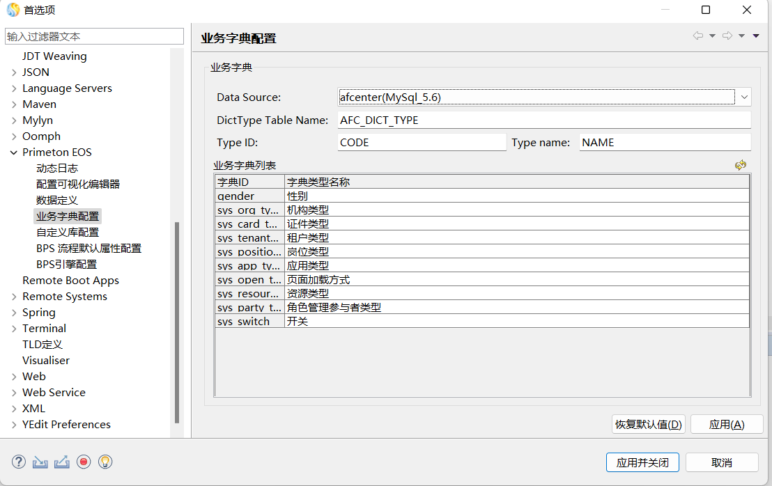 验证业务字典数据源 首选项->primeton EOS->业务字典配置 中选择上一步建立的afcenter数据源,刷新业务字典表,如下图: