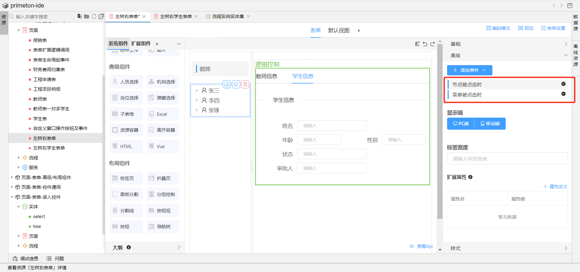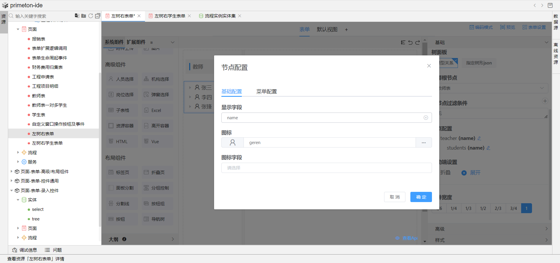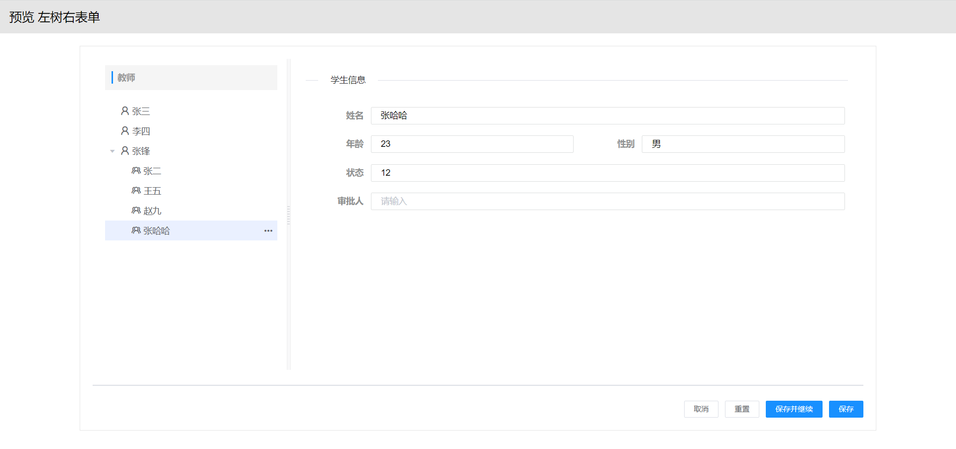 7.完成上述配置,即可预览左树右视图成果展示,点击左侧树教师信息,即可在右侧展示该教师下得学生信息视图。