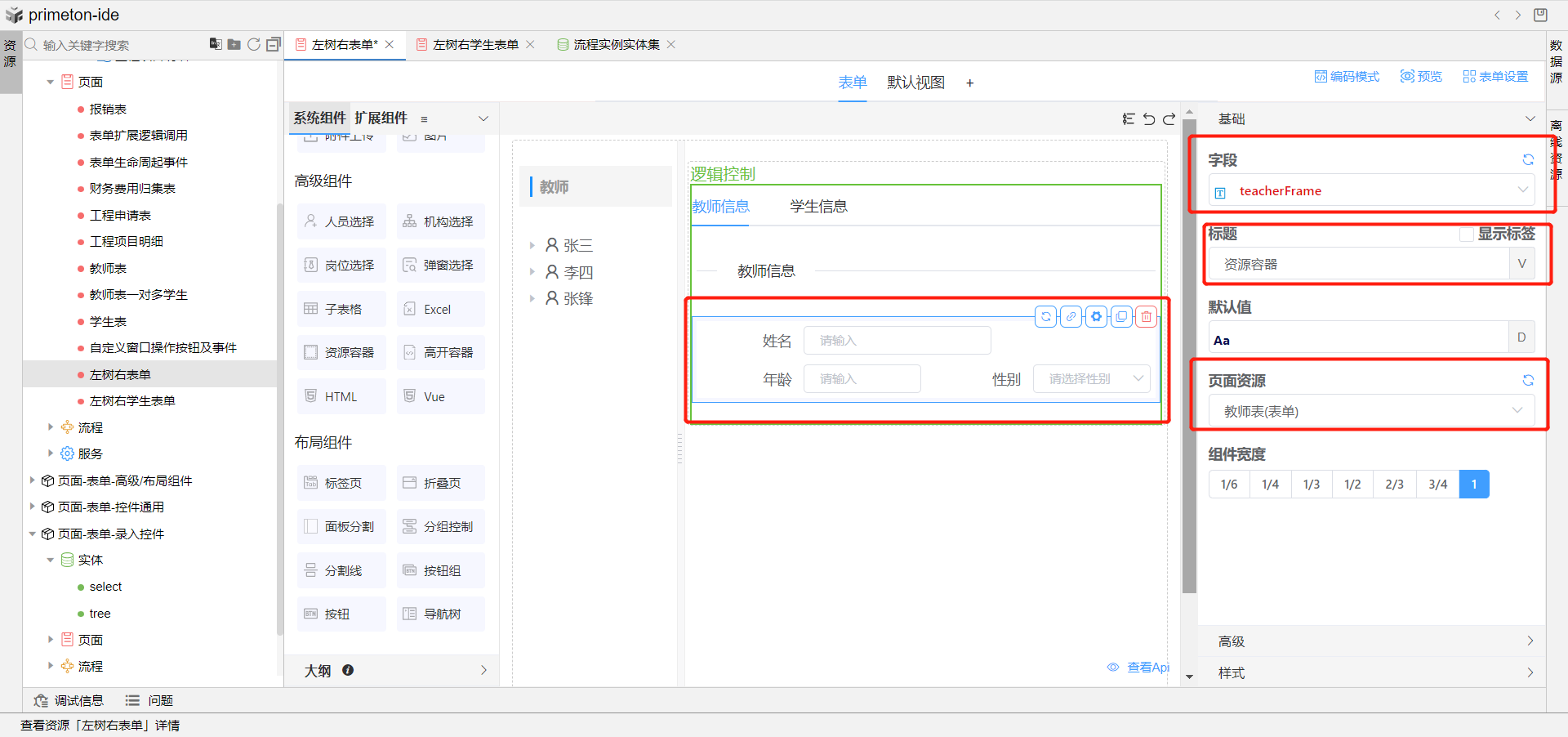 然后在教师与学生信息的标签页分别拖入页面资源容器,并绑定对应的表单。并给两处资源容器的字段分别输入绑定teacherFrame、studentFrame。